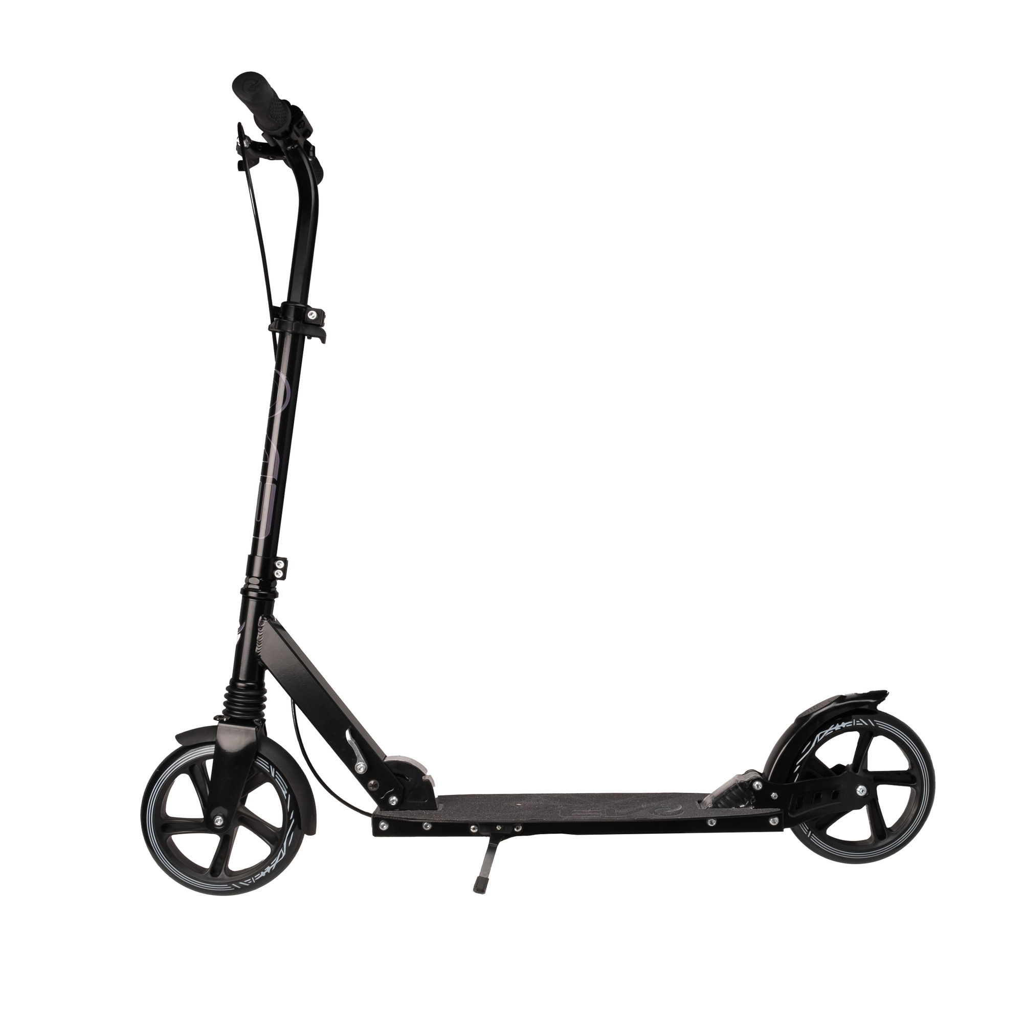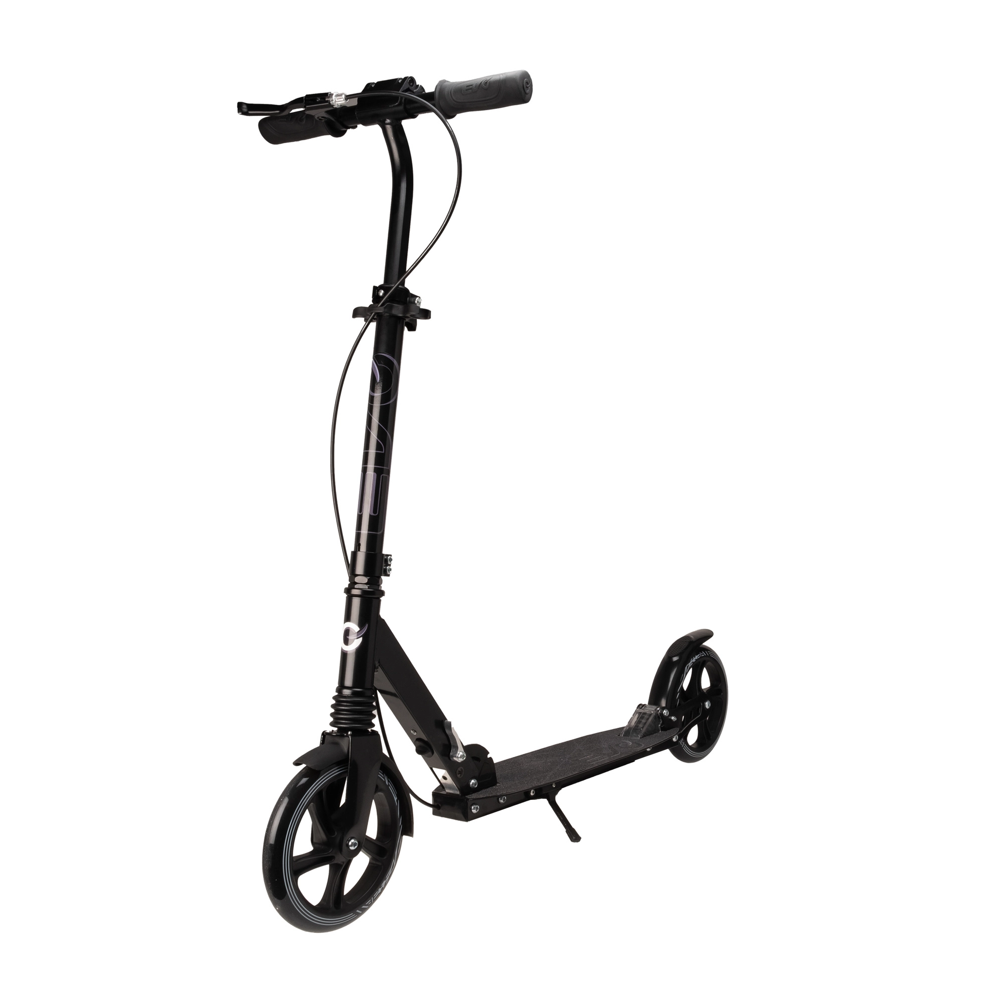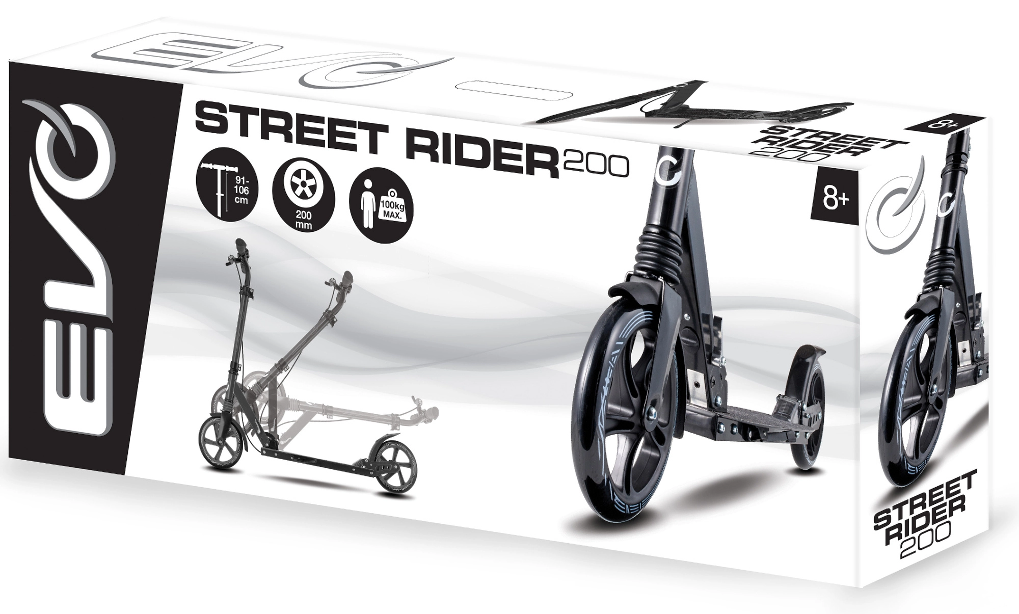 Lehká a odolná koloběžka EVO Street Rider 200 pro jezdce od 8 let nabízí velká 200mm kola, snížený valivý odpor díky ložiskům ABEC-7, přední i zadní odpružení, skládací mechanismus pro snadné přenášení a výškově nastavitelná řídítka. O bezpečné zastavení se stará zadní nášlapná brzda i přední ruční brzda, stabilitu zvyšuje protiskluzová deska a praktická integrovaná stojánka.