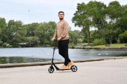 Koloběžku během chvilky složíte, postavíte na stojánek a díky nastavitelnému popruhu pohodlně odnesete.