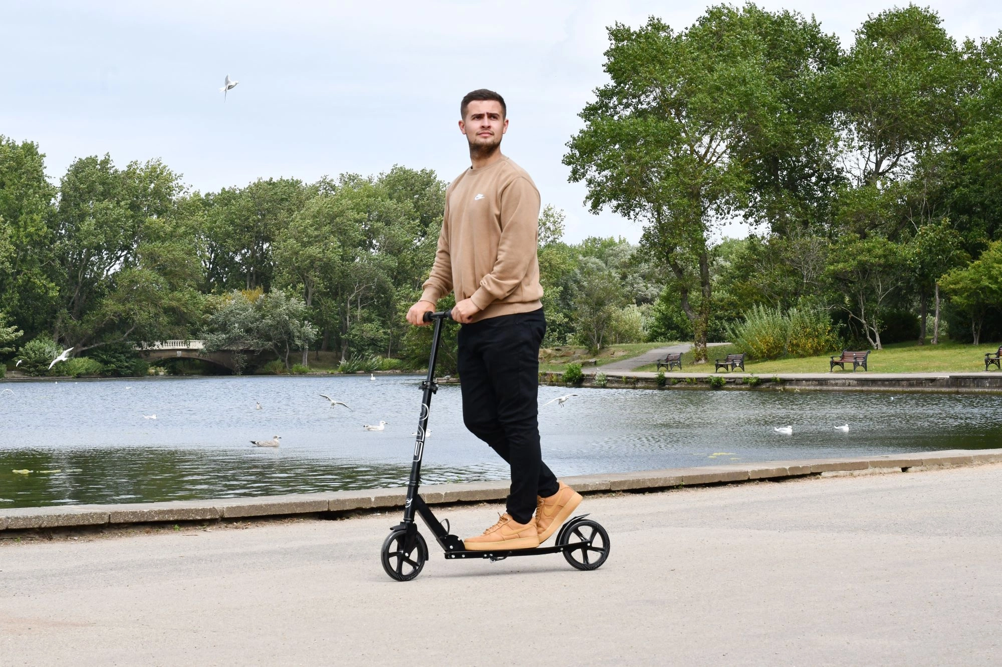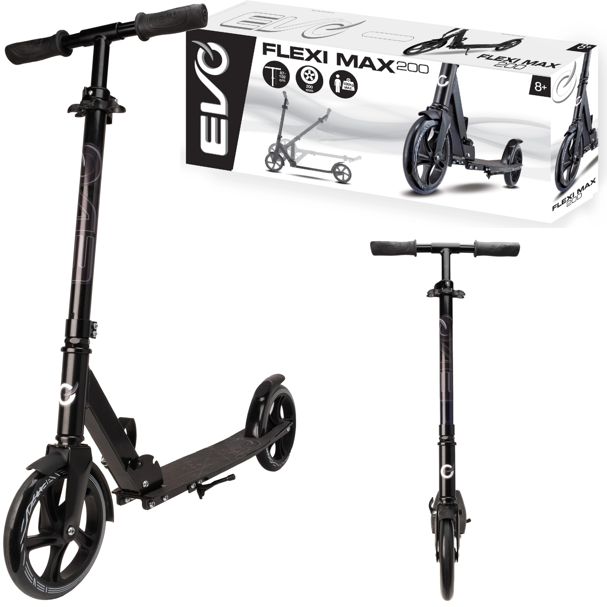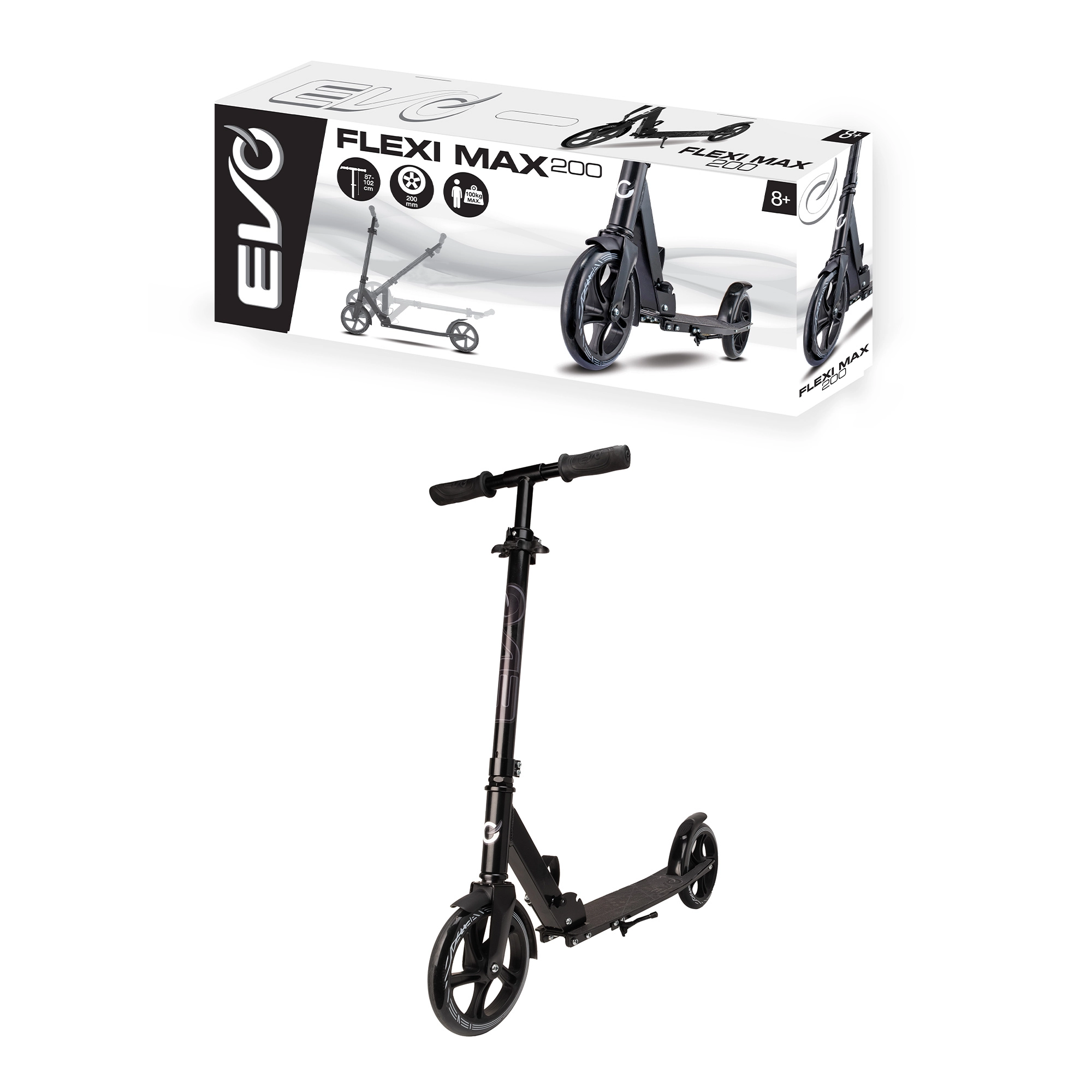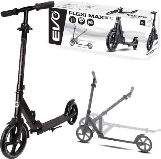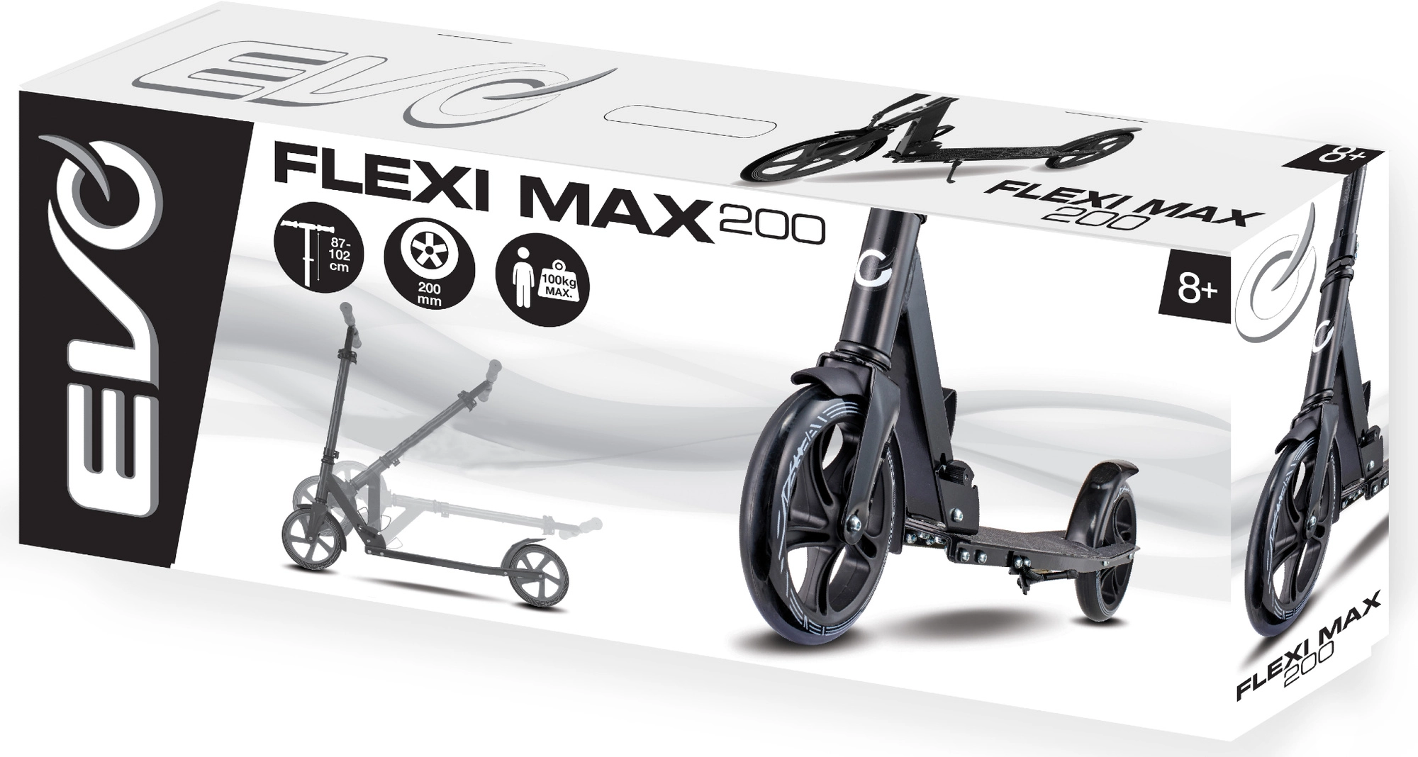 EVO Flexi Max 200 je spolehlivá městská koloběžka navržená pro pohodlné dojíždění i volnočasovou jízdu. Velká kola 200 mm s ložisky ABEC-7 zajišťují nižší odpor a rychlejší rozjezd, zatímco gumové TPR gripy poskytují jistý úchop bez klouzání. Nastavitelná výška řídítek (cca 87–102 cm) roste spolu s jezdcem a sklopný stojánek usnadní parkování.