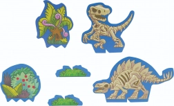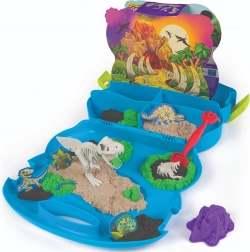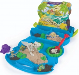 Set podporuje jemnou motoriku, představivost a smyslové vnímání. V sadě najdete bohaté příslušenství: plastový skelet, formičky, nástroj na hrabání, kartonové figurky rostlin a dinosaurů i barevná kulisa pro sestavení mini dinosauřího světa.