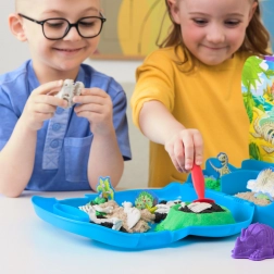 Tento kreativní set s kinetickým pískem přináší dětem realistický zážitek z vykopávek fosilií T‑Rex. Díky rozdělené tácové vaničce mají děti vše přehledně po ruce, mohou míchat barvy písku, tvarovat krajinu a skládat dinosauří skelet jako otisky či formu. Písek je příjemný na dotek, drží tvar a přitom nezanechává nepořádek.