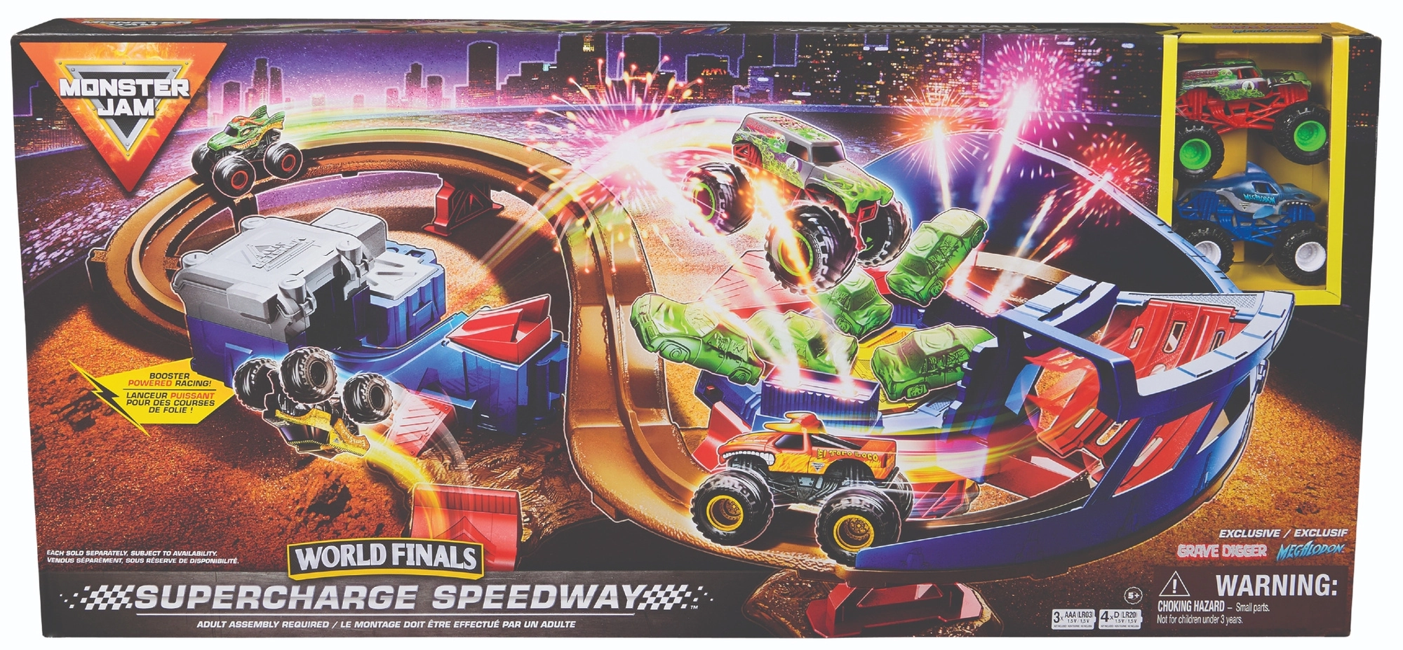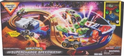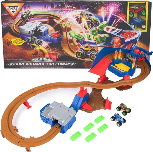 Set MONSTER JAM Supercharge Speedway mění stůl nebo podlahu v arénu plnou adrenalinu. Ručně ovládaný odpalovač vyšle trucky do vysokých rychlostí, zatímco zvýšené úseky, mostky a zatáčky vedou přímo do osvětlené crash zóny pro efektní nárazy a přistání. Po projetí kola se vozidla vracejí na start – zábava tak běží bez přestávek.