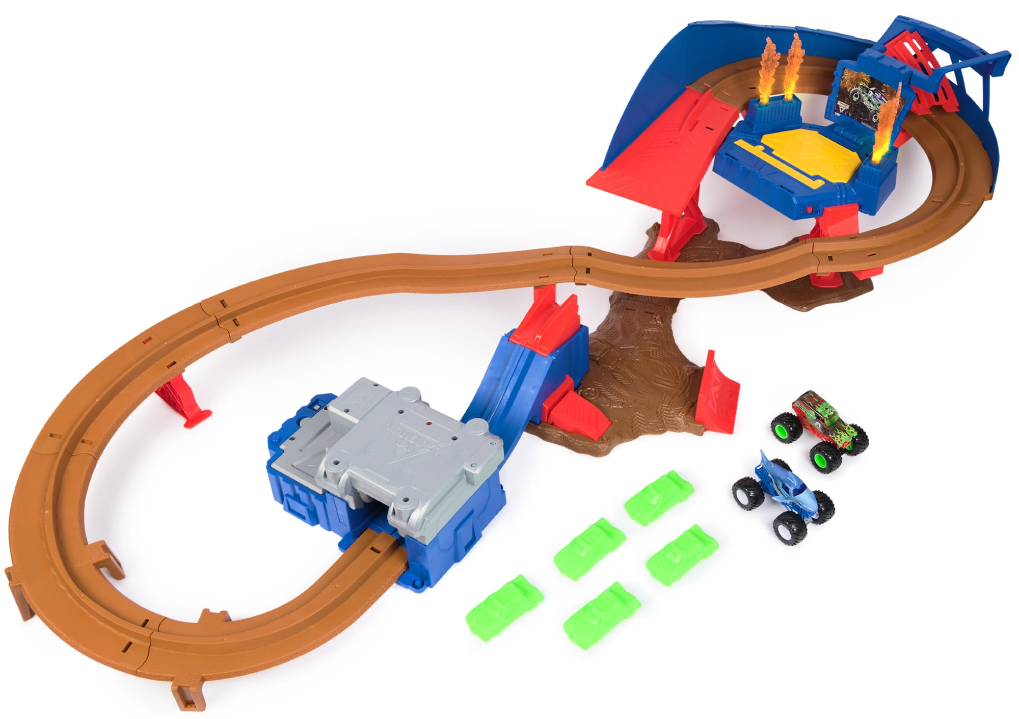 Stavba je intuitivní a odolná, s barevnými podpěrami a plamenovými dekoracemi pro autentický vzhled show MONSTER JAM. Díky kompaktnímu skládání se set snadno ukládá a rychle připraví na další závod.