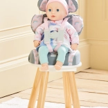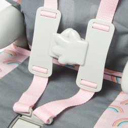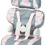 Šedo‑růžové provedení s duhovým vzorem je nejen roztomilé, ale i praktické – materiály jsou odolné a příjemné na dotek. Autosedačka je vhodná pro panenky do 46 cm a skvěle se hodí na hraní doma, na cestách i při krmení panenek.