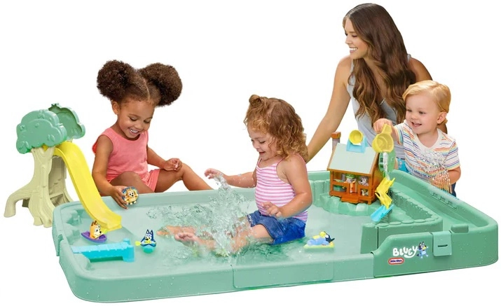 Vodní stůl BLUEY Bushland Adventures je ideální pro společnou hru více dětí. Otevřené herní zóny, integrovaná skluzavka, strom a chatka s funkčním vodním kolem podporují kreativitu, rozvoj jemné motoriky i sociální dovednosti. Kanálky a přehrady umožní směrovat proud vody a vytvářet fontánky (možnost připojení hadice), takže každá hra je jiná.