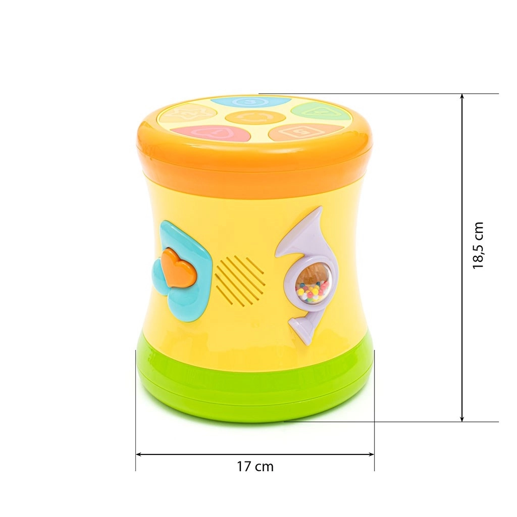 Interaktivní oboustranný bubínek BABY MIX ve žlutém provedení nadchne děti od 10 měsíců. Nabízí 8 melodií, 12 veselých písniček, světelné efekty a zvuky bubnu, které podporují sluch, zrak, jemnou motoriku i koordinaci ruka–oko. Skvělá zábava a učení v jednom.