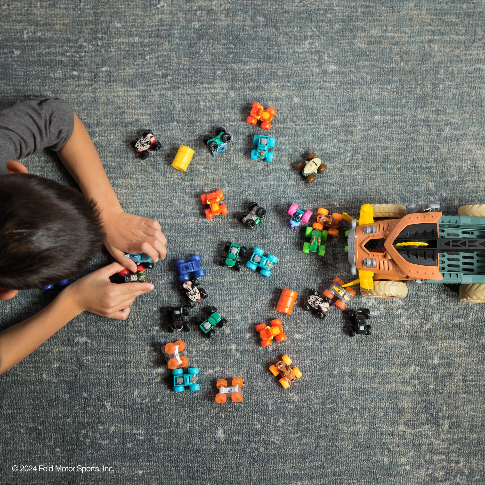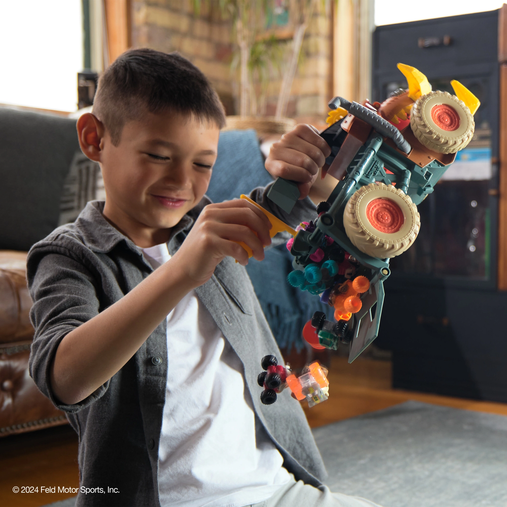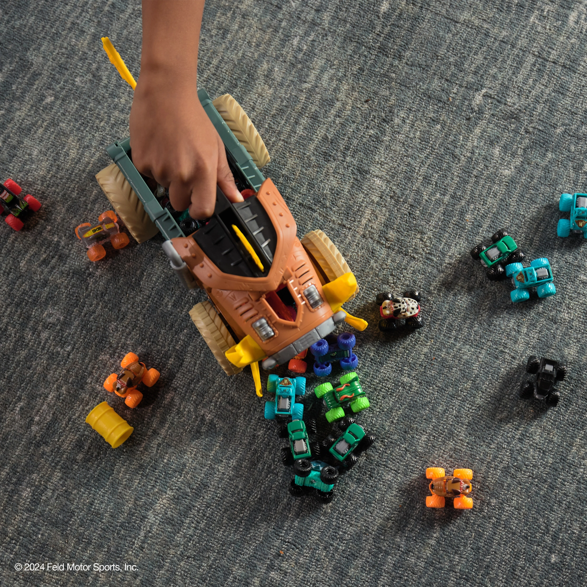 Velký Mad Hog Chomper s otevírací „tlamou“ a robustními koly zvládne nabírat mini Megalodon truck a příslušenství. Děti si užijí akční hru, při které mohou vozidla sbírat, převážet a skladovat přímo uvnitř Chompera – skvělý způsob, jak motivovat k pořádku po hraní.