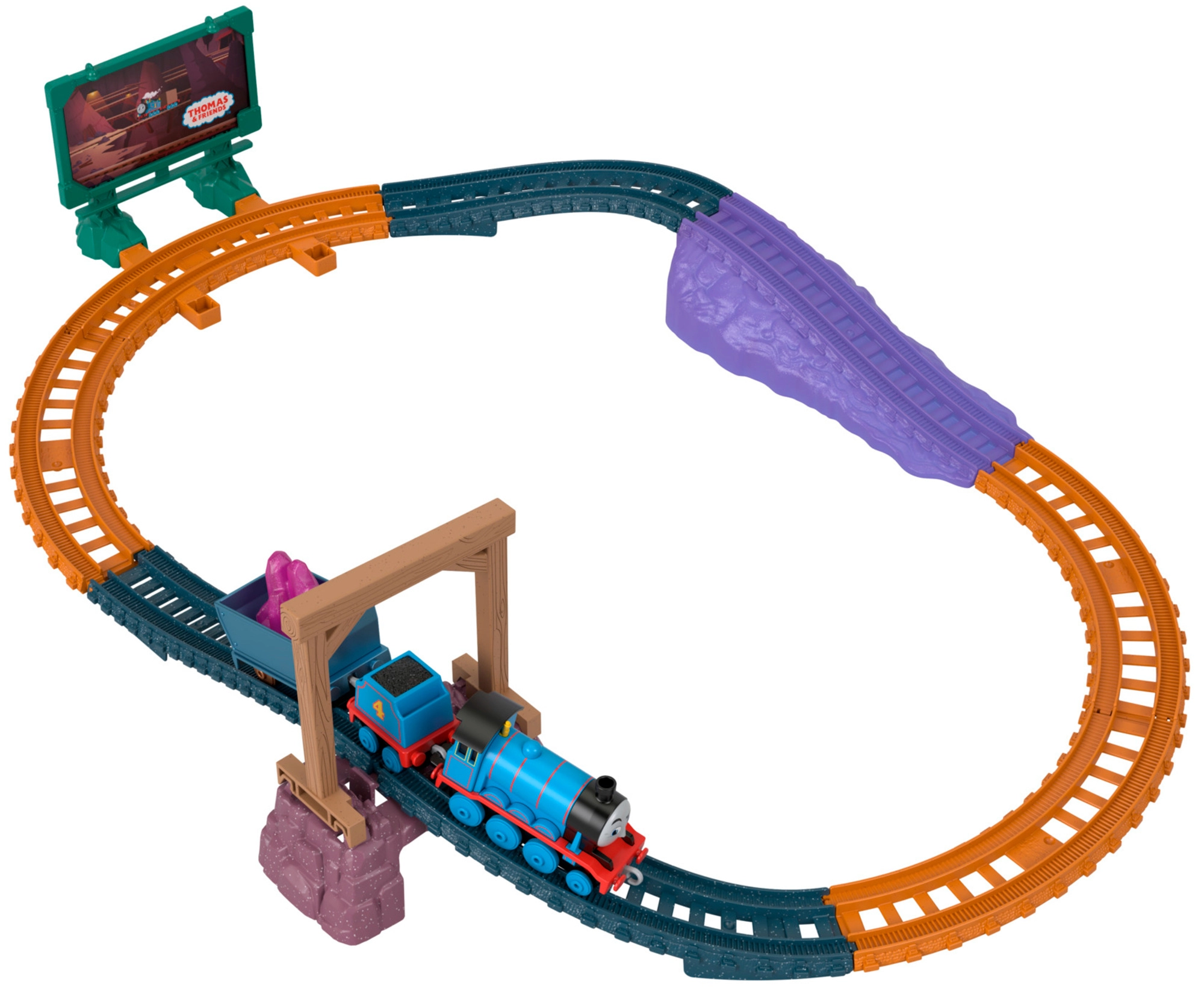 Oválné koleje s mostem, tunelovou rampou a billboardem vytvářejí dynamické prostředí pro hraní a příběhy z dolu.