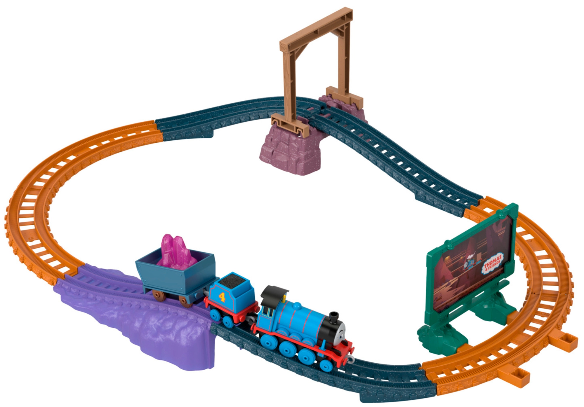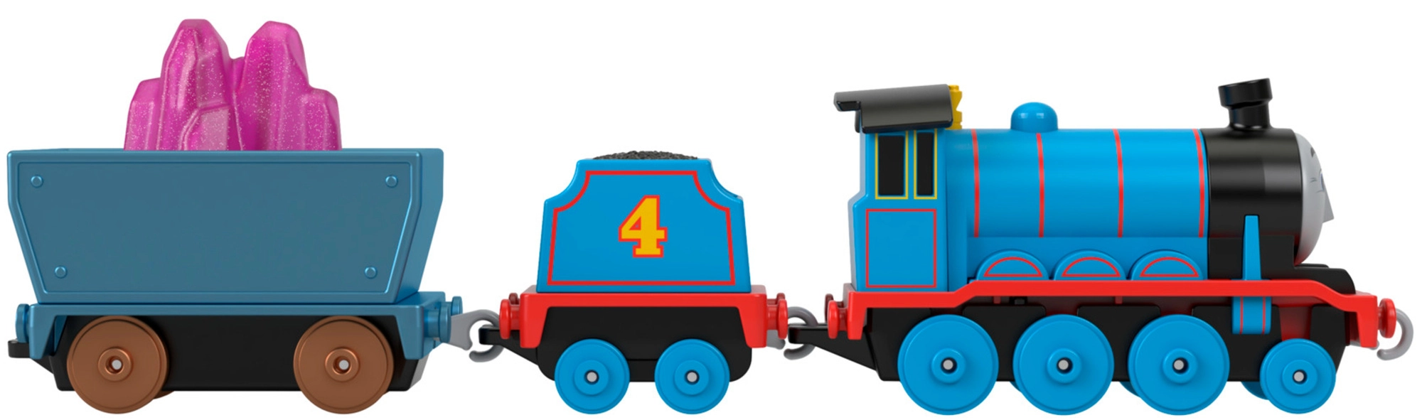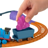 Součástí je modrá lokomotiva s tendrem, otevřený vůz a náklad krystalů pro realistické převážení surovin po trati.