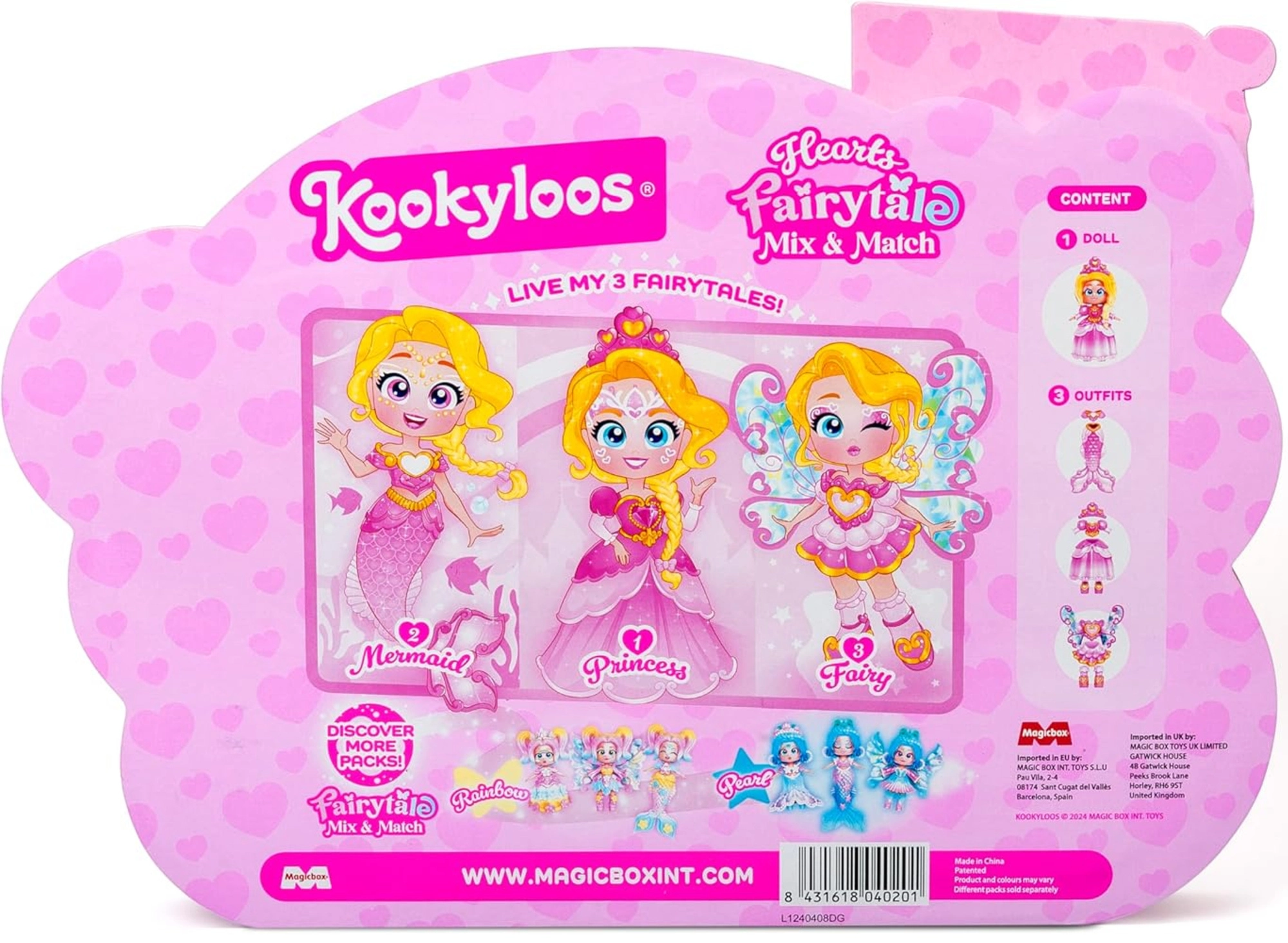 Objevte kouzelný svět KookyLoos s figurkou Hearts, která se během okamžiku promění v princeznu, vílu nebo mořskou pannu. Díky mix & match systému snadno kombinujete oblečky a doplňky, zatímco jedinečný mechanismus na jedno kliknutí mění 3 různé výrazy tváře. Kvalitní zpracování, třpytivé detaily a pohyblivé klouby zaručí kreativní hru a dlouhé hodiny zábavy.