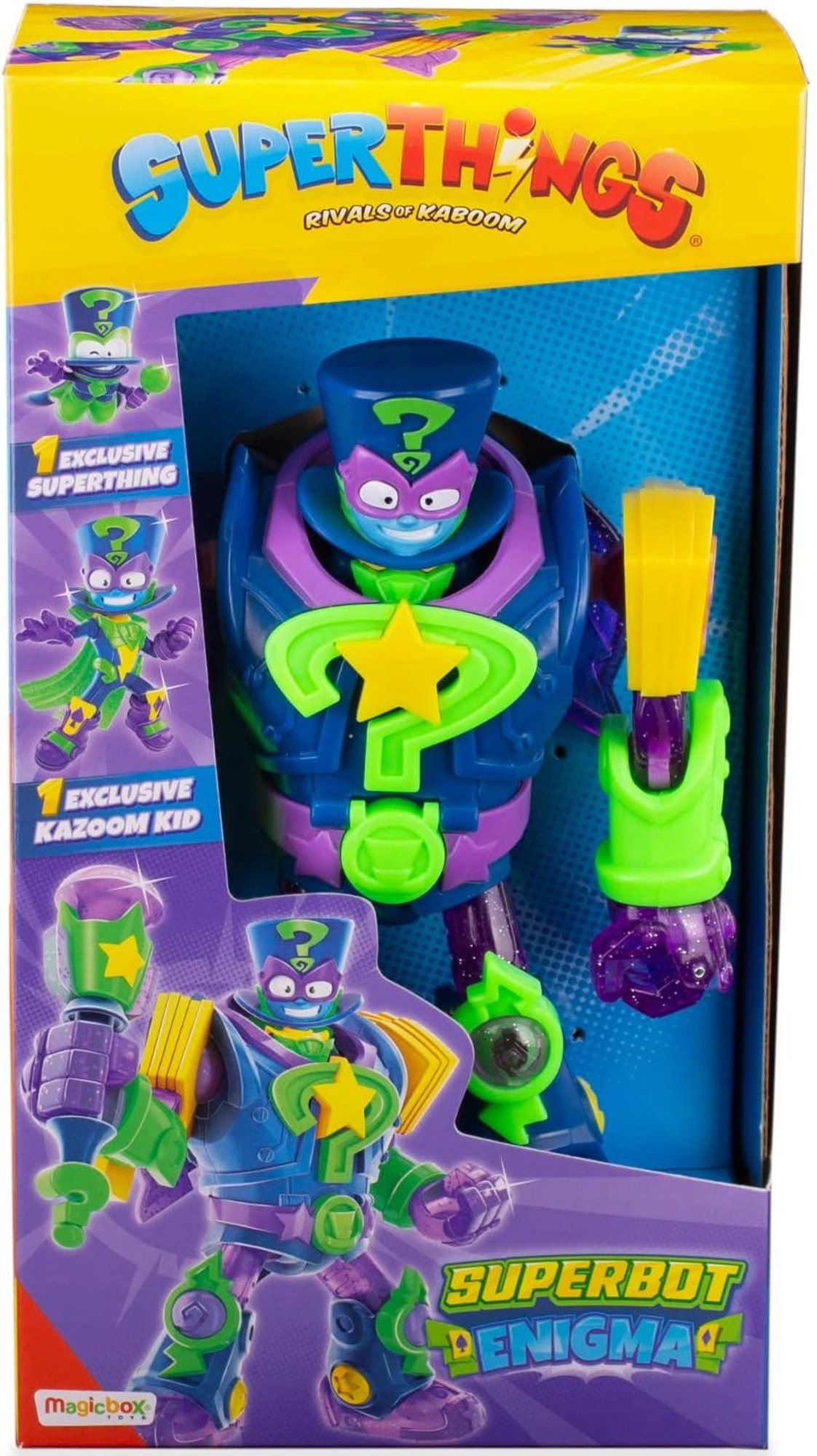 SuperThings Enigma Superbot přináší spojení výrazného designu, funkčních mechanismů a napínavých herních možností. Díky pohyblivým rukám a nohám lze robota snadno pózovat a vytvářet akční scény. Po stisknutí tlačítka se rozvinou mechanická křídla pro dramatické úniky a lety nad Kaboom City.