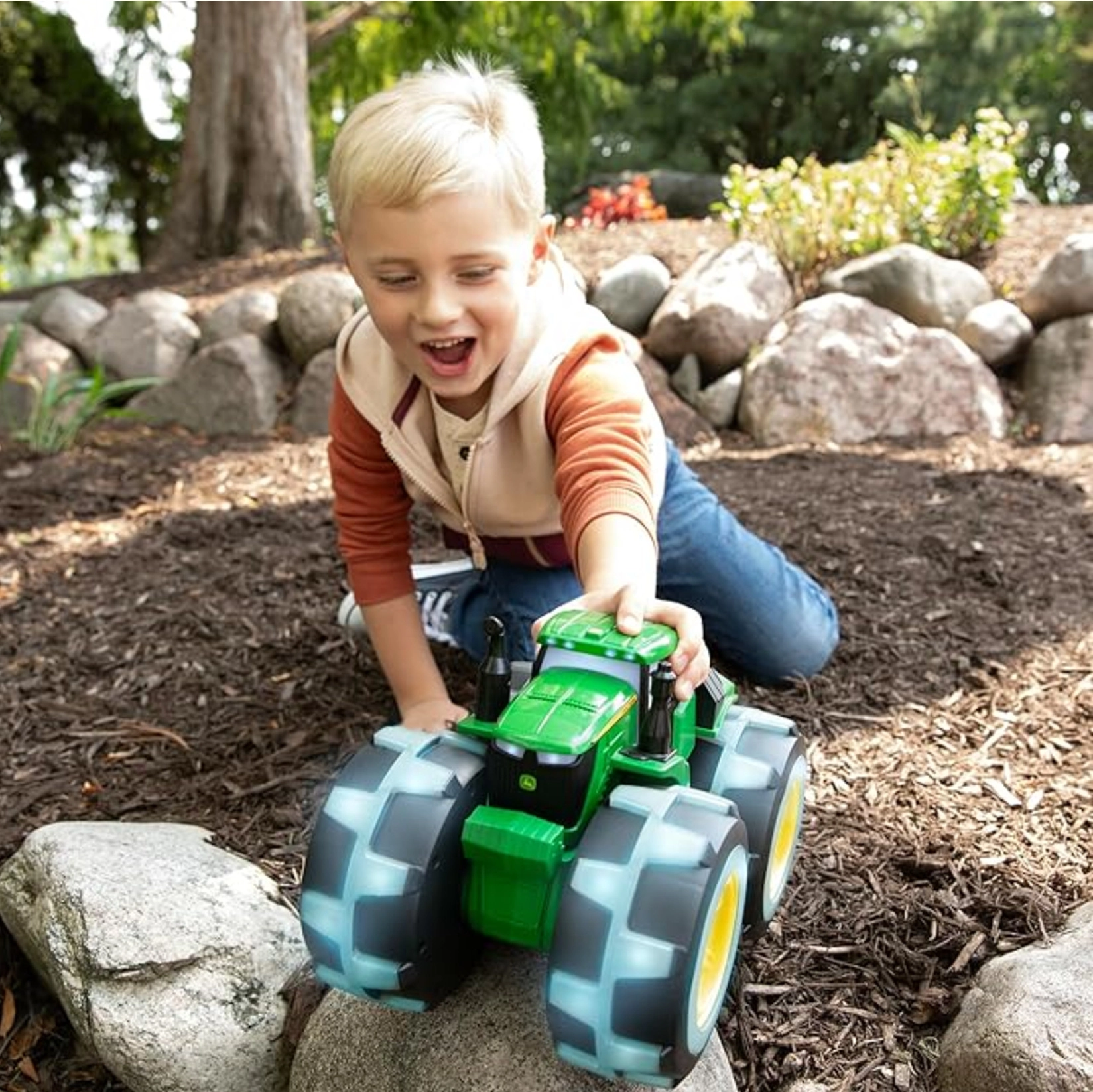 Jednoduché ovládání jedním tlačítkem spouští barevné LED podsvícení kol a zvuky motoru, které se mění podle jízdy. Díky velkým kolům s výrazným vzorkem je traktor ideální pro hru v interiéru i exteriéru.