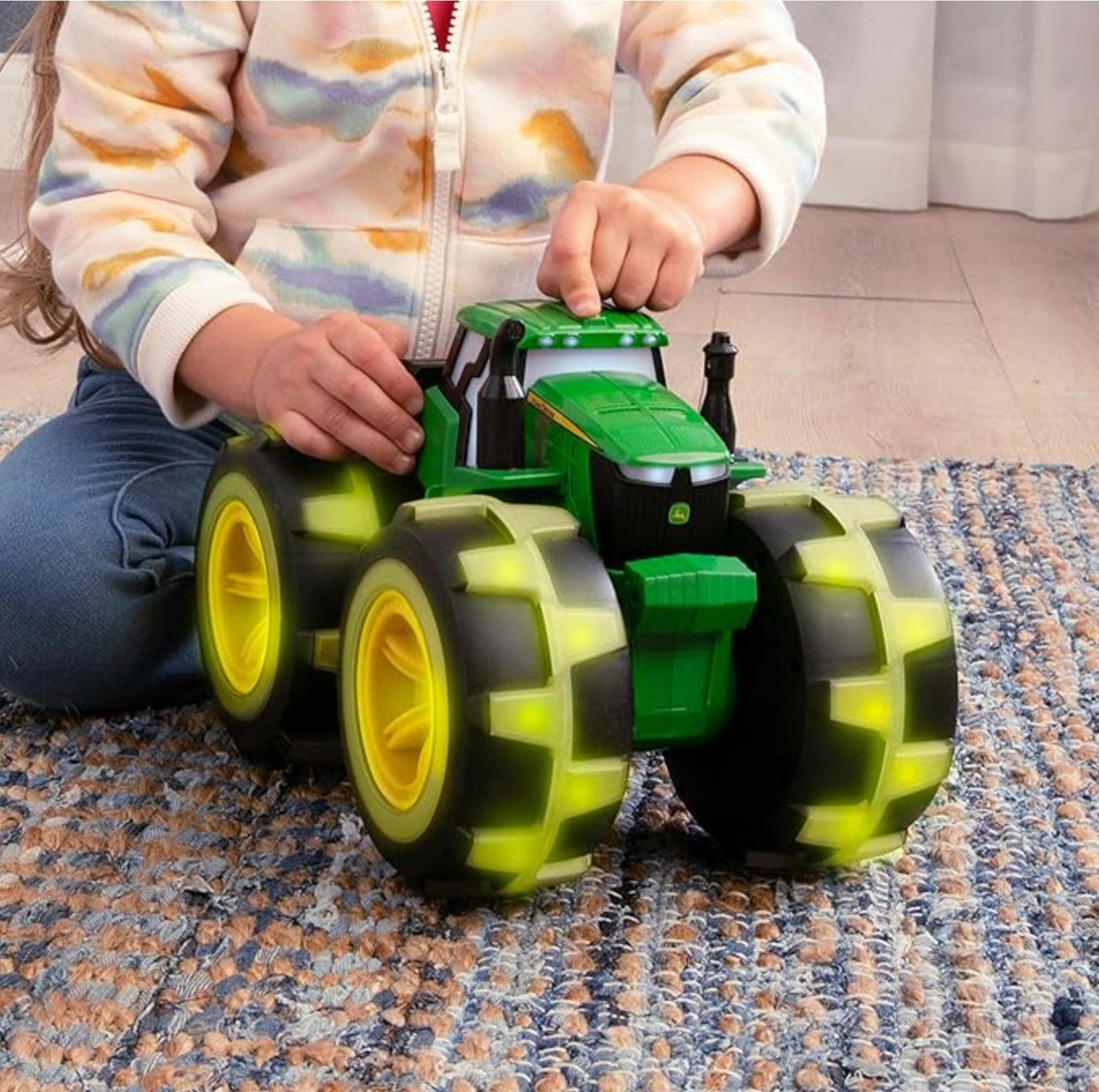 Zelený traktor na licenci John Deere od značky Tomy přináší svítící kola, zvukové efekty a odolnou konstrukci pro zábavu doma i venku. Stačí zmáčknout jedno tlačítko na střeše a užít si světelné LED efekty a realistické zvuky motoru. Velká terénní kola se skvělou trakcí zvládnou koberce i zahradu.