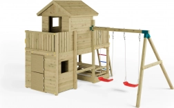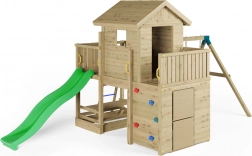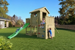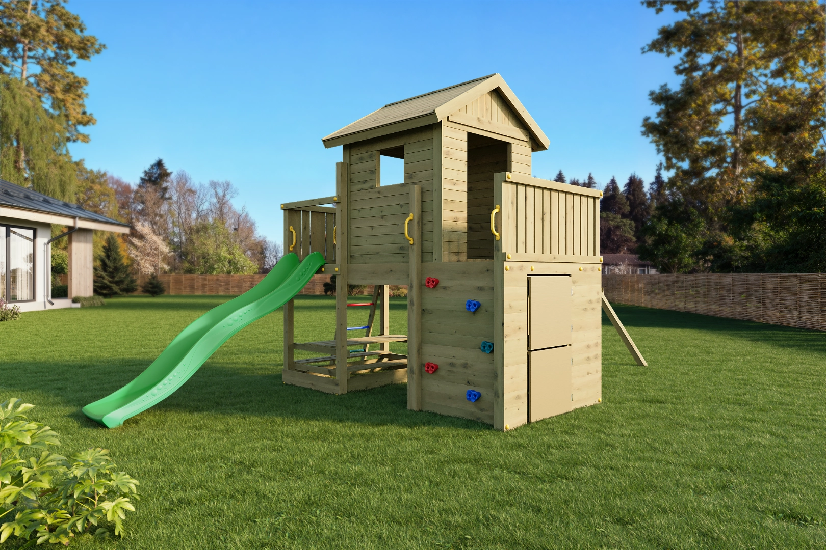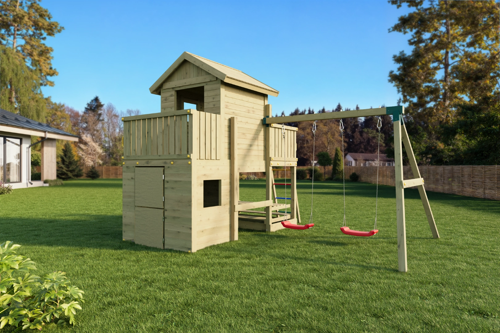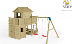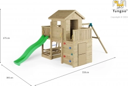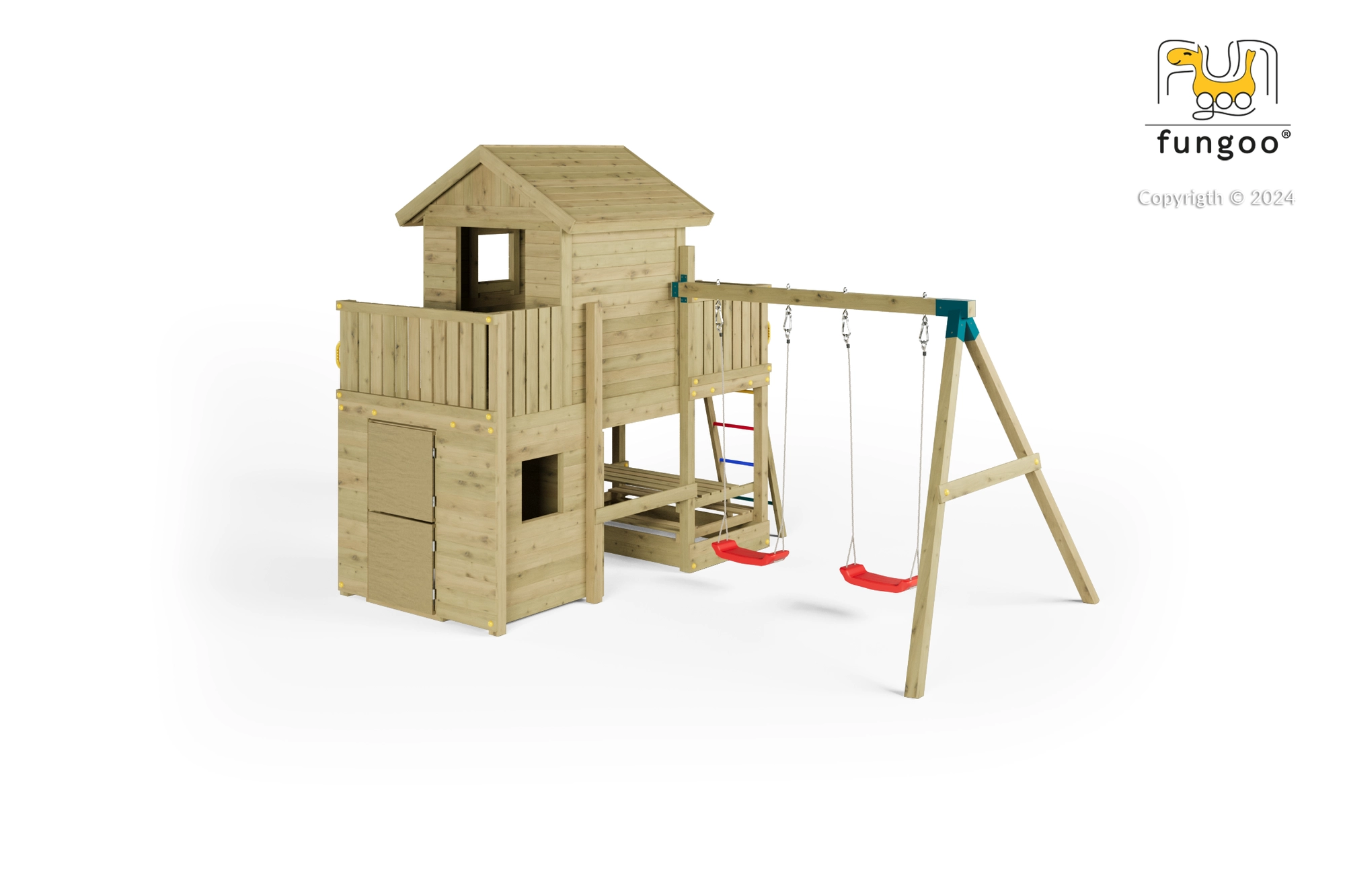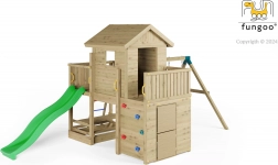Hřiště FUNGOO Multifort KDI přináší dětem pestrý svět pohybu a fantazie přímo na vaši zahradu. Stabilní dřevěná konstrukce s domečkem a střechou poskytuje útočiště ve stínu, zatímco skluzavka, lezecká stěna a dvojitá houpačka lákají ke každodenní zábavě. Tlaková impregnace KDI zvyšuje odolnost dřeva vůči vlhkosti a počasí.