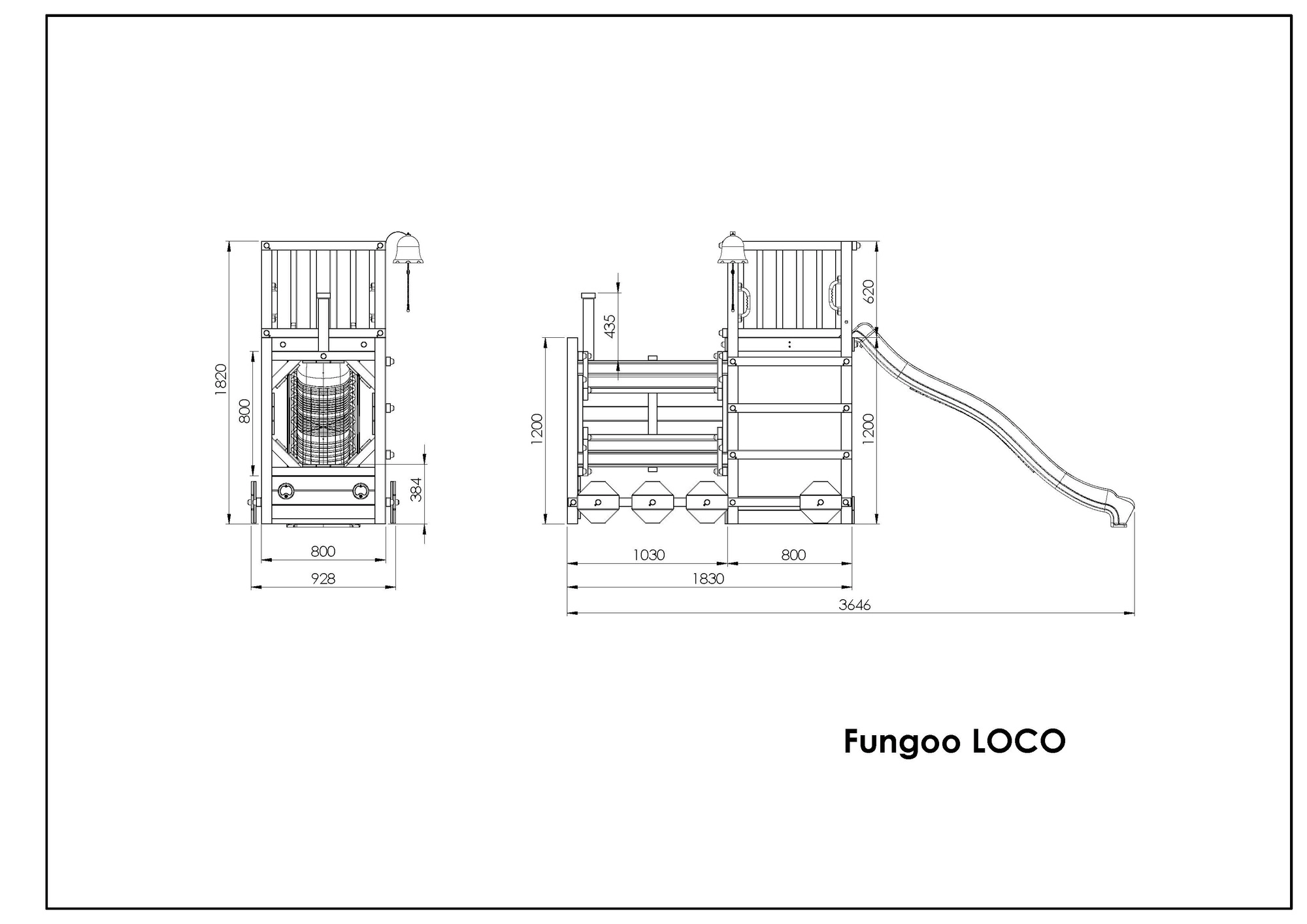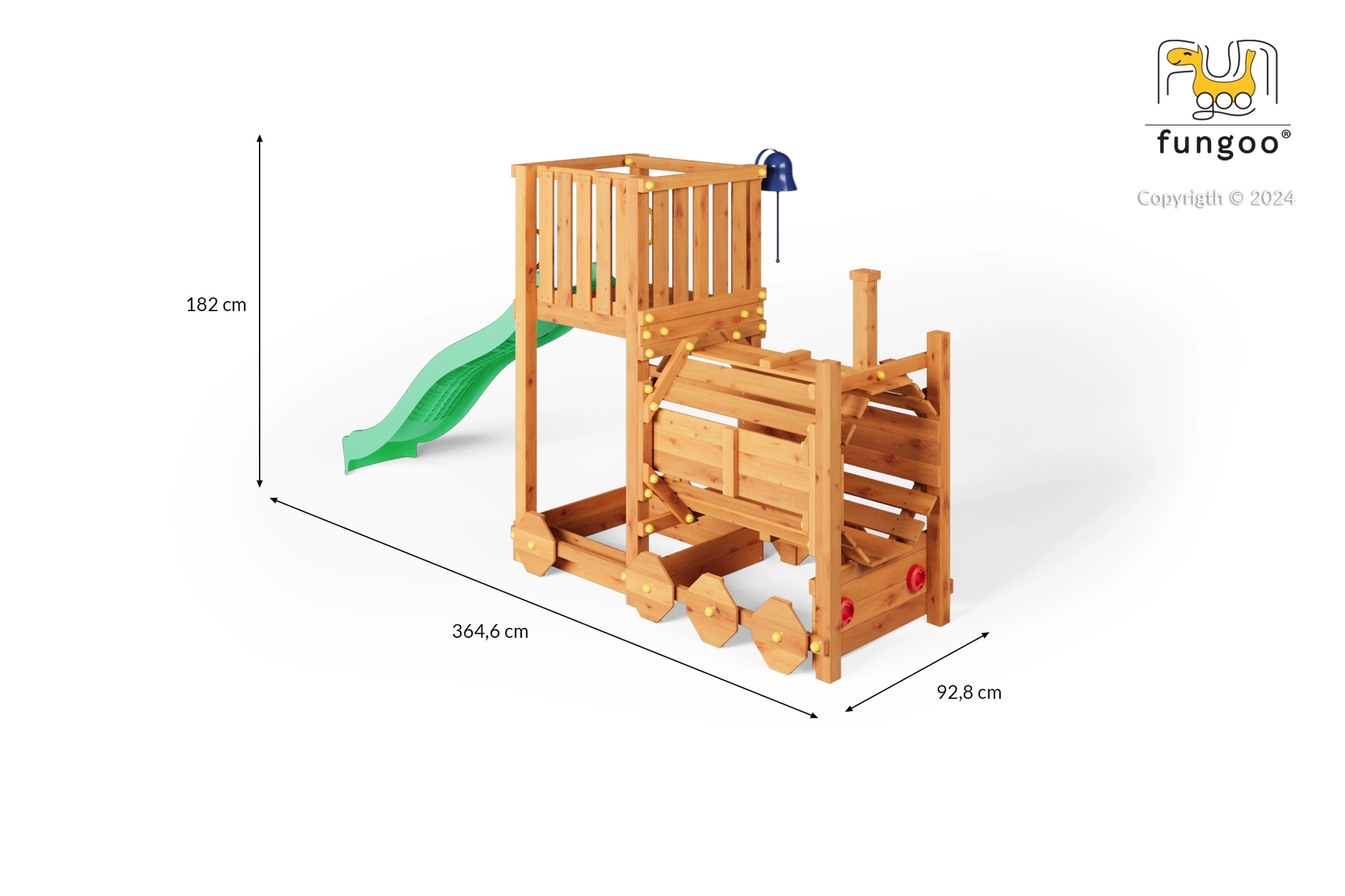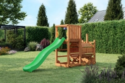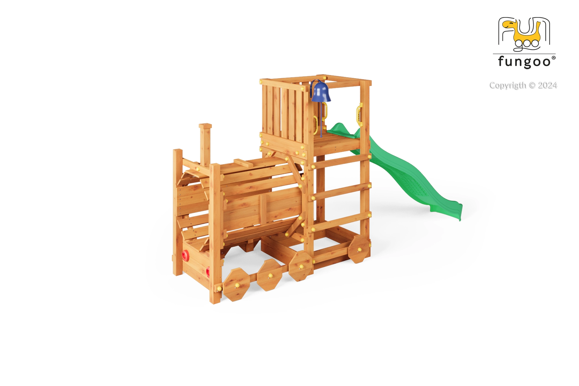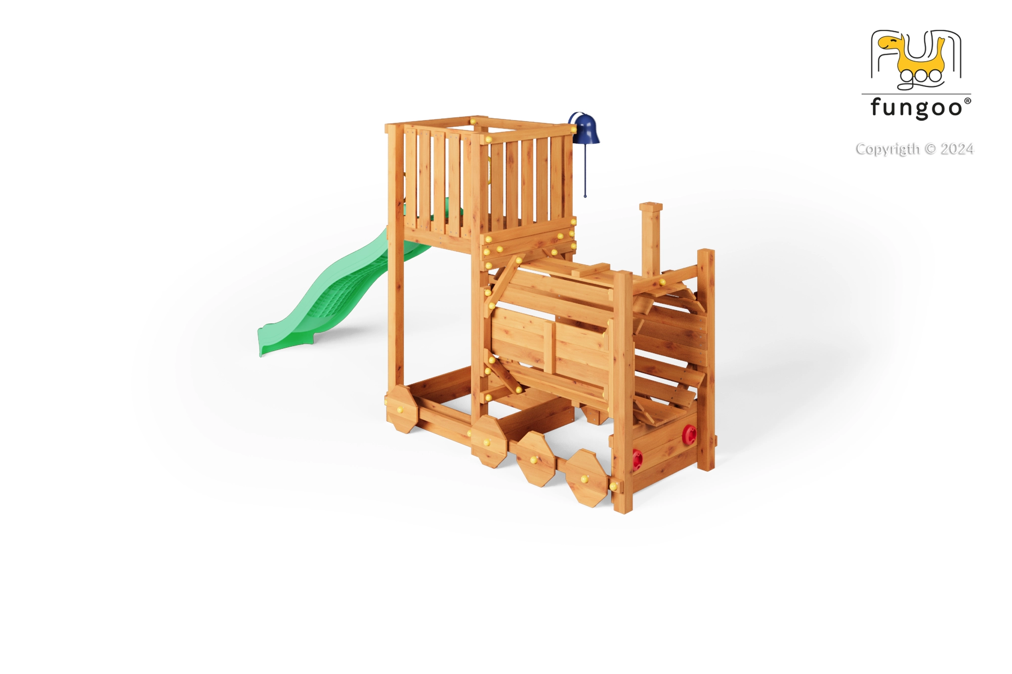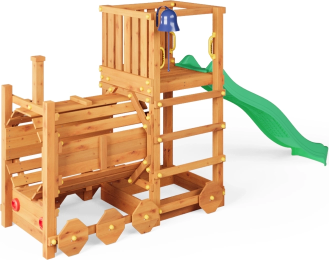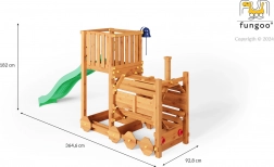 Hřiště FUNGOO Loco je navržené jako lokomotiva s tunelem, která láká ke hraní na průlezy, skrývání i role-play na mašinfíru. Dlouhá vlnitá skluzavka 2,2 m zajistí spoustu zábavných jízd, zatímco zvonek podpoří dětskou představivost a interaktivní hru. Konstrukce z kvalitního, impregnovaného dřeva je odolná vůči počasí a bezpečně ukotvená do země.