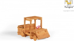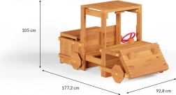 Konstrukce je vyrobena z kvalitního dřeva ošetřeného impregnací v teakovém odstínu pro vyšší odolnost proti vlhkosti a UV. Součástí jsou zemní kotvy a bezpečnostní úchyty pro stabilitu a jistotu při divočejší hře. Model je navržen pro 2 malé řidiče zároveň a nabízí praktický úložný prostor na drobnosti nebo hračky.