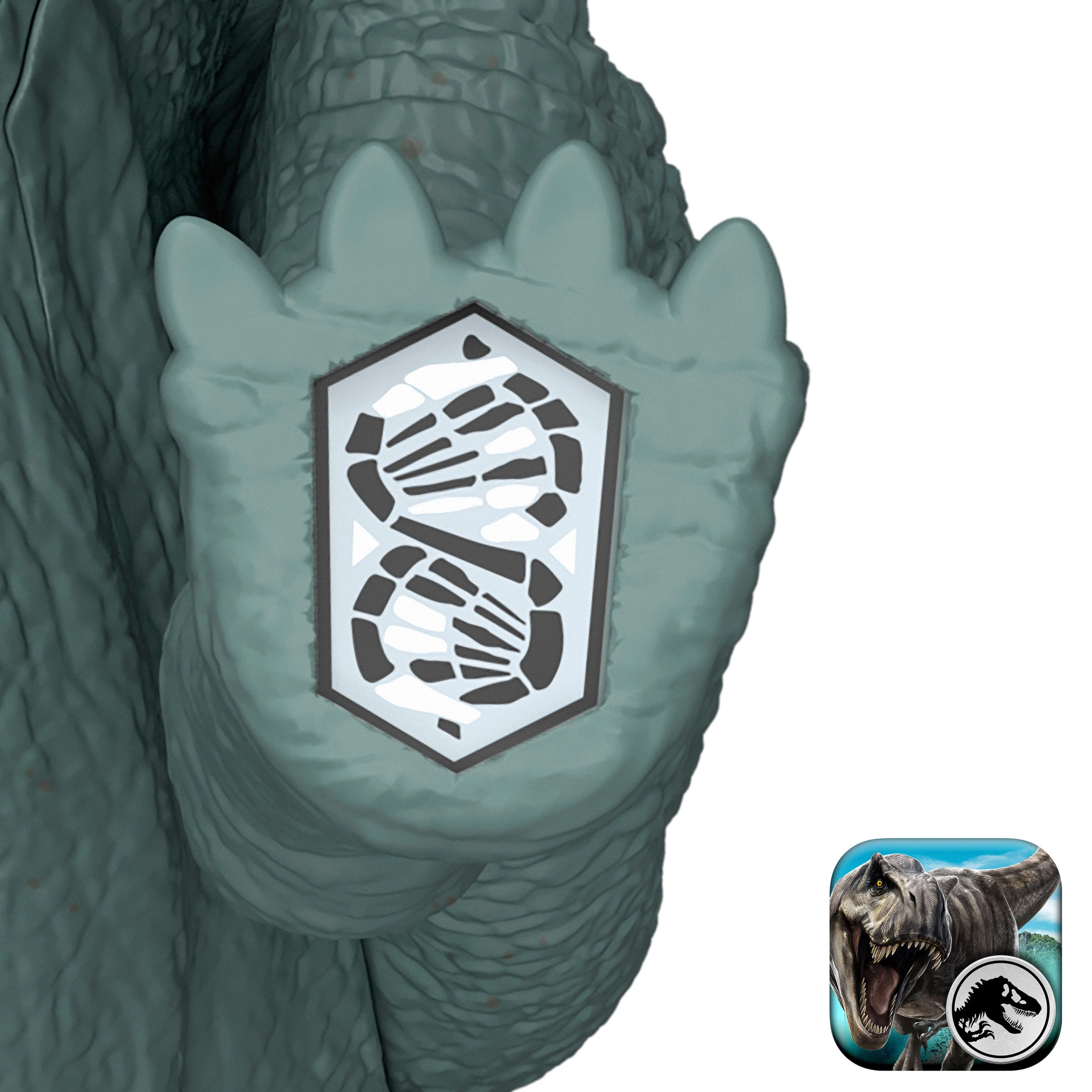 Skrytý DNA kód na noze figurky lze naskenovat v bezplatné aplikaci Jurassic World Reborn: Facts (Android/iOS). V AR prostředí prozkoumáte kosterní model v rentgenovém režimu, termální pohled i vzdělávací obsah a užijete si minihry, jako je závodění s dinosaury nebo hledání fosilií.