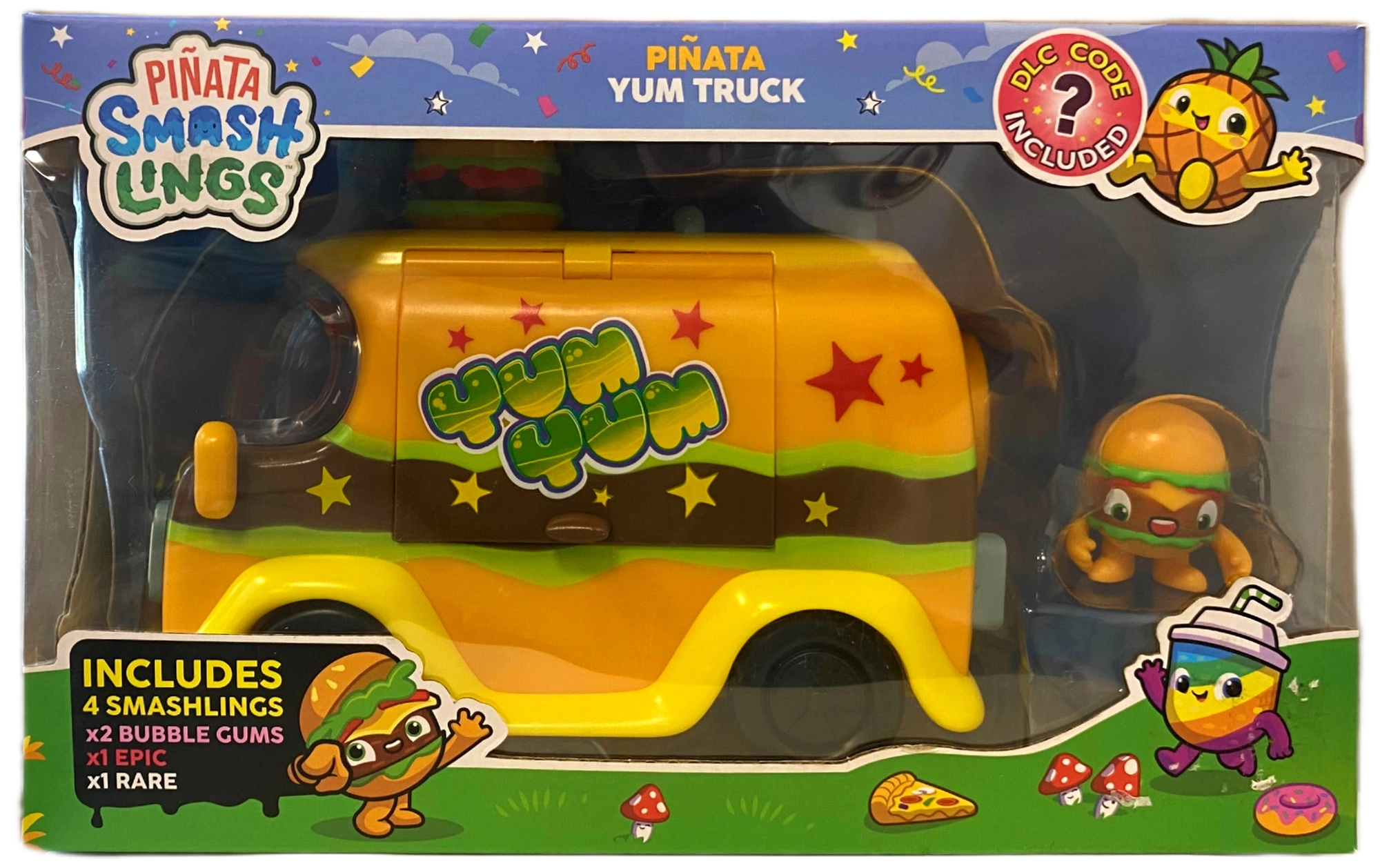 Objevte tropický svět sladkostí, kde z duhových piniat ožívají roztomilé a energické bytůstky Smashlings. Tento oficiální set Yum Truck Playset přináší stylový food truck s otevíracími dveřmi a interiérem připraveným na party, čtyři barevné figurky (cca 3,5–4 cm) a tři „foodie“ doplňky pro servírování dobrot. Díky DLC kódu navíc odemknete unikátní obsah ve hře.