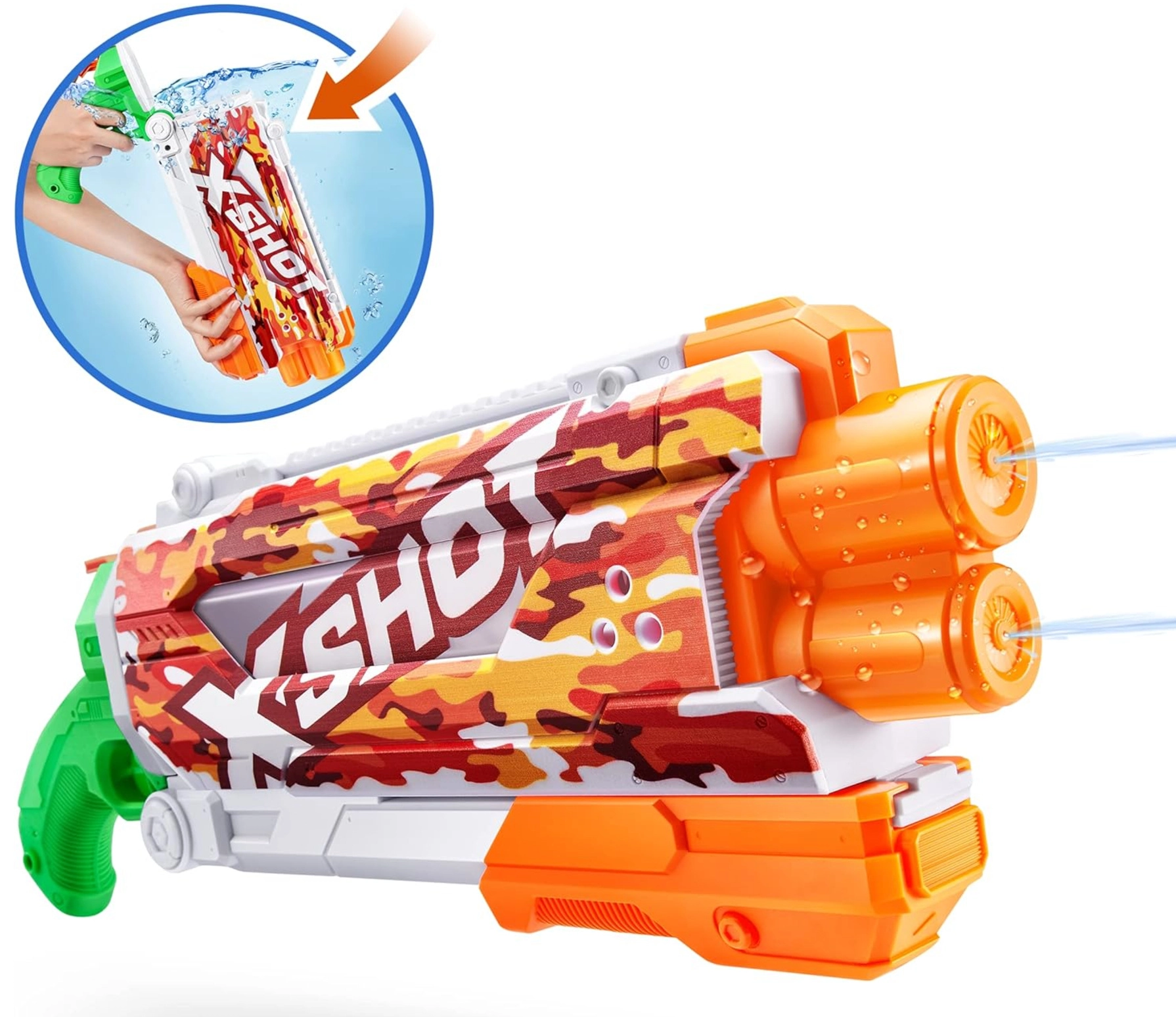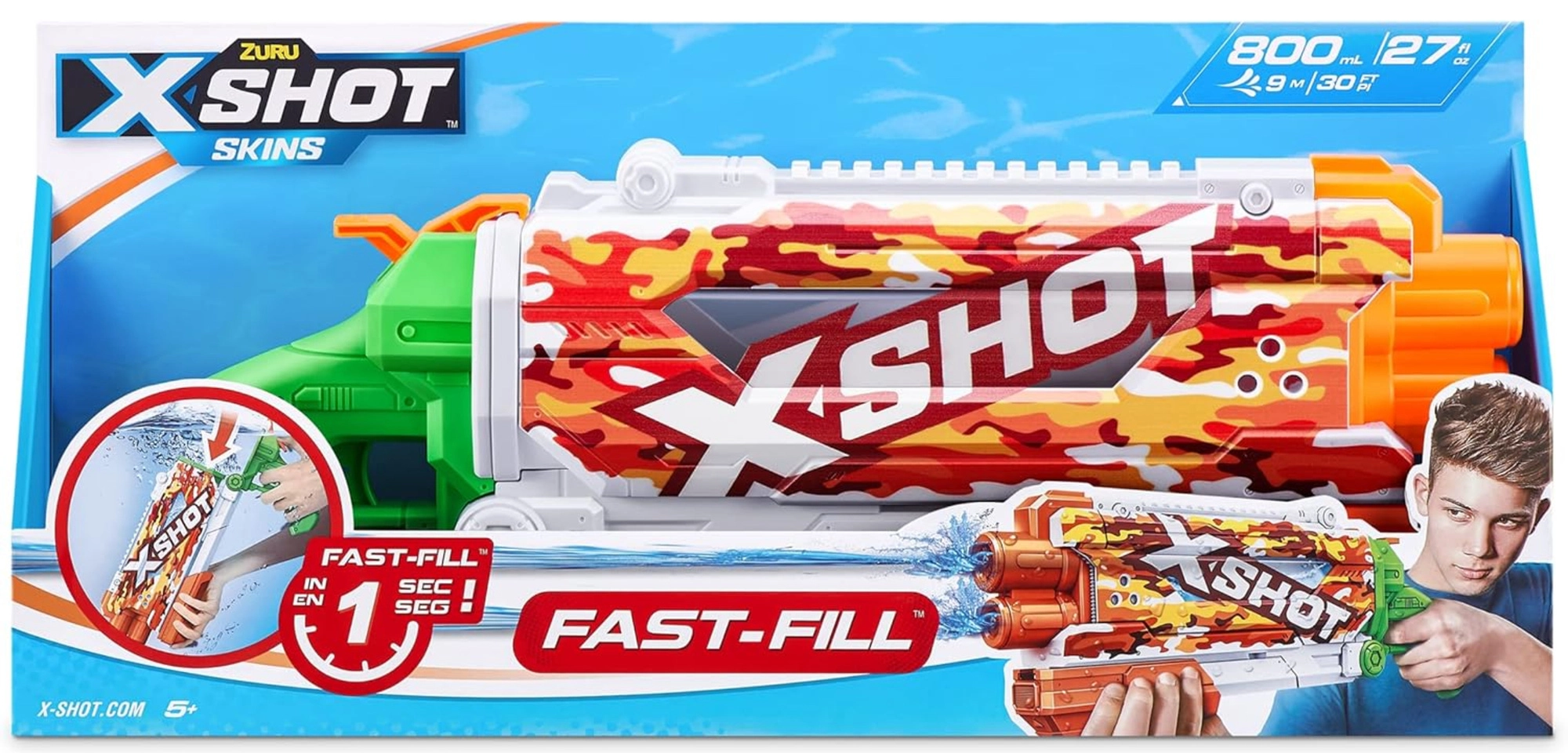 Vodní pistole ZURU X SHOT SKINS Fast-Fill Sun Camo přináší rychlé doplňování vody a silný proud pro maximální zábavu. Inovativní Fast-Fill systém vám umožní doplnit vodu přímo z kohoutku či kbelíku během jediné sekundy, takže se rychle vrátíte do akce. Díky dostřelu až 10 m zasáhnete soupeře s přesností a výkonem.