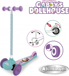 Tato tříkolová koloběžka v tyrkysovo‑fialové barevné kombinaci s grafikou oblíbených hrdinů z GABBY’S DOLLHOUSE je skvělou volbou pro malé jezdce od 3 let. Díky dvěma předním kolům je mimořádně stabilní, lehká konstrukce usnadňuje manipulaci a nožní brzda na zadním blatníku zajišťuje bezpečné zpomalení i zastavení.