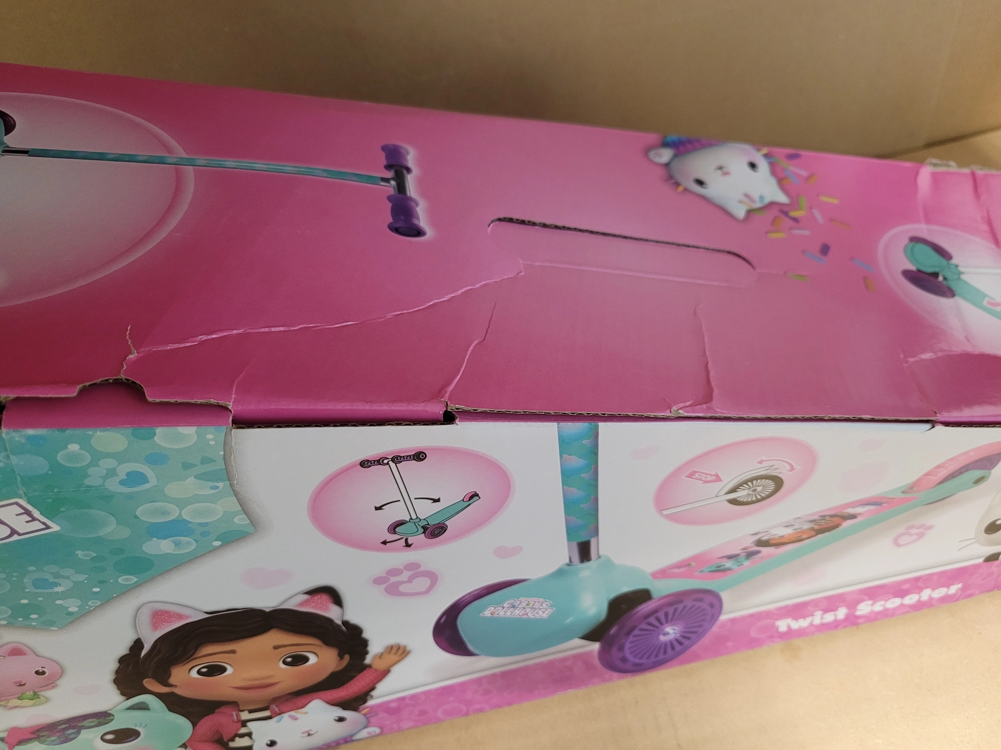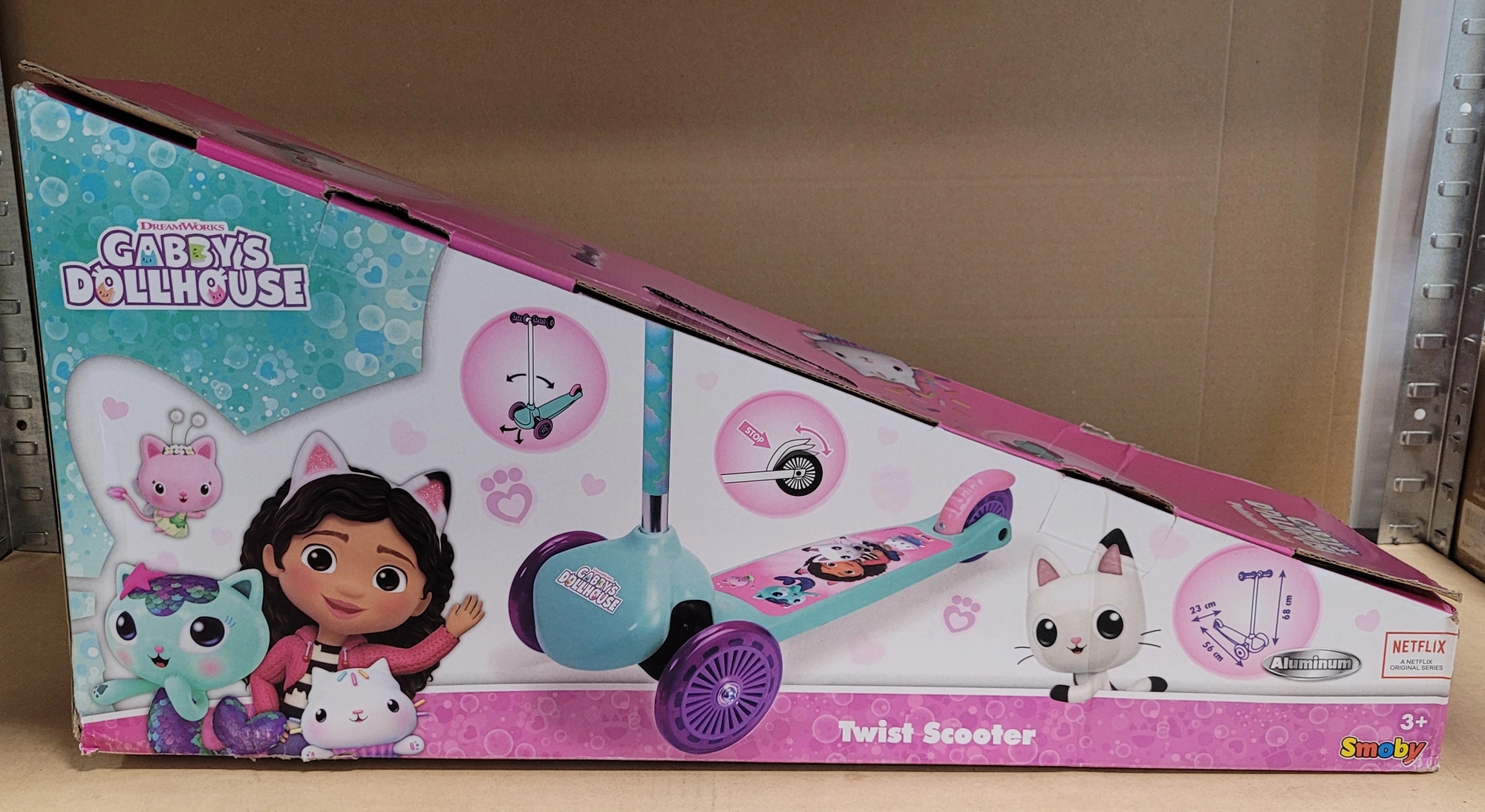 Lehká a stabilní dětská koloběžka s motivem GABBY’S DOLLHOUSE pro děti od 3 let. Nabízí tři kola pro jistotu a rovnováhu, balanční zatáčení pro snadné ovládání, tichá kolečka a zadní nožní brzdu pro bezpečné zastavení. Ideální pro první jízdy a rozvoj motoriky. Poznámka: poškozený obal, produkt je plně funkční.