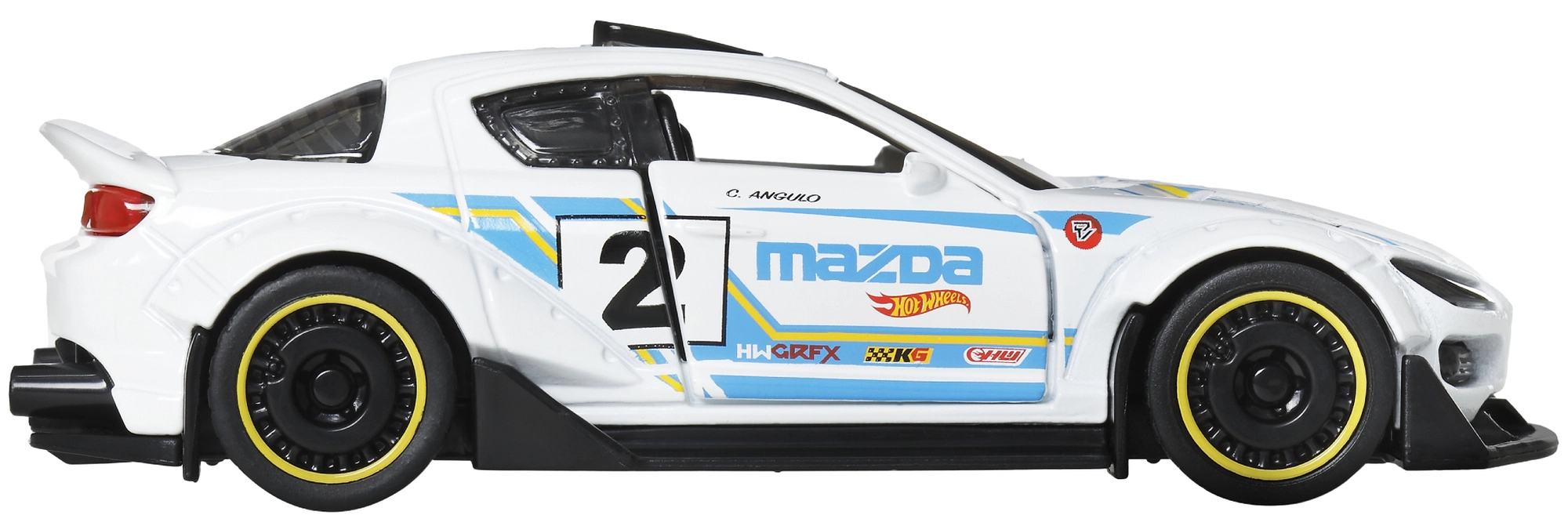 Bílá karoserie, modré závodní pruhy a aerodynamické prvky zajišťují realistický vzhled pro hraní i sbírku.