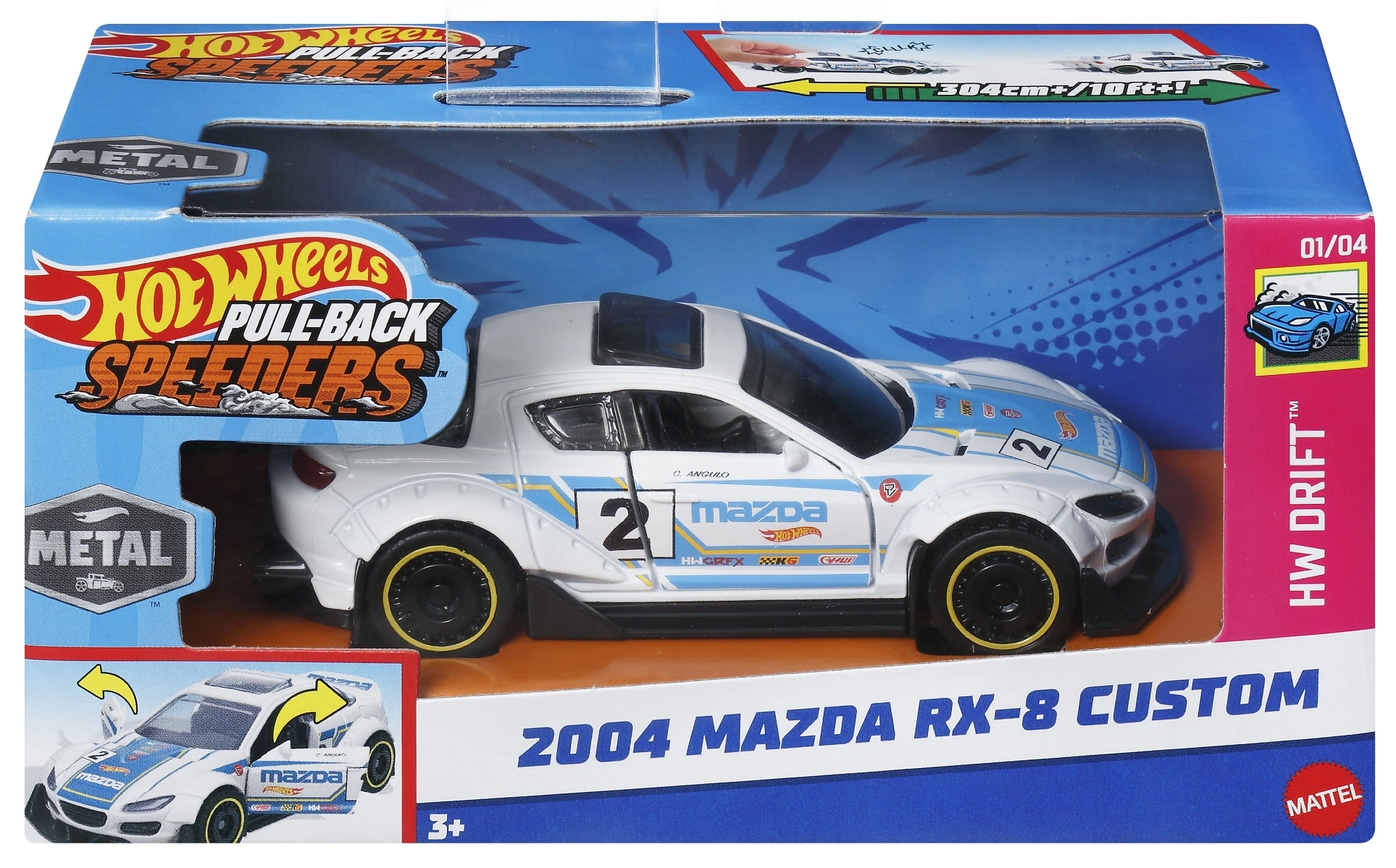 Zažijte akční jízdu s autíčkem HOT WHEELS 2004 Mazda RX-8 Custom ze série Pull-Back Speeders v měřítku 1:43. Díky zpětnému natahovacímu pohonu stačí auto natáhnout dozadu a pustit – vyrazí kupředu impozantní rychlostí. Model zaujme bílou karoserií, závodním polepem a detailním zpracováním, má volně se otáčející kola a je ideální pro hru i sbírání.
