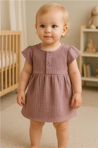 Mušelínové šaty New Baby v jemném levandulovém odstínu jsou skvělou volbou pro teplé dny. Díky střihu do A a nariasené sukýnce působí roztomile a zároveň poskytují volnost pohybu. Přední zapínání usnadňuje rychlé převlékání bez zbytečného stresu.