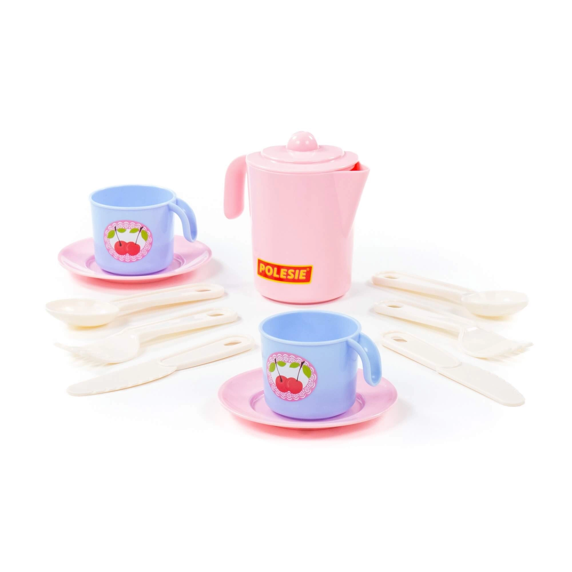 - Kompletní výbava: konvička s víčkem, 2 hrnky, 2 talířky, 2 nože, 2 vidličky a 2 lžíce.