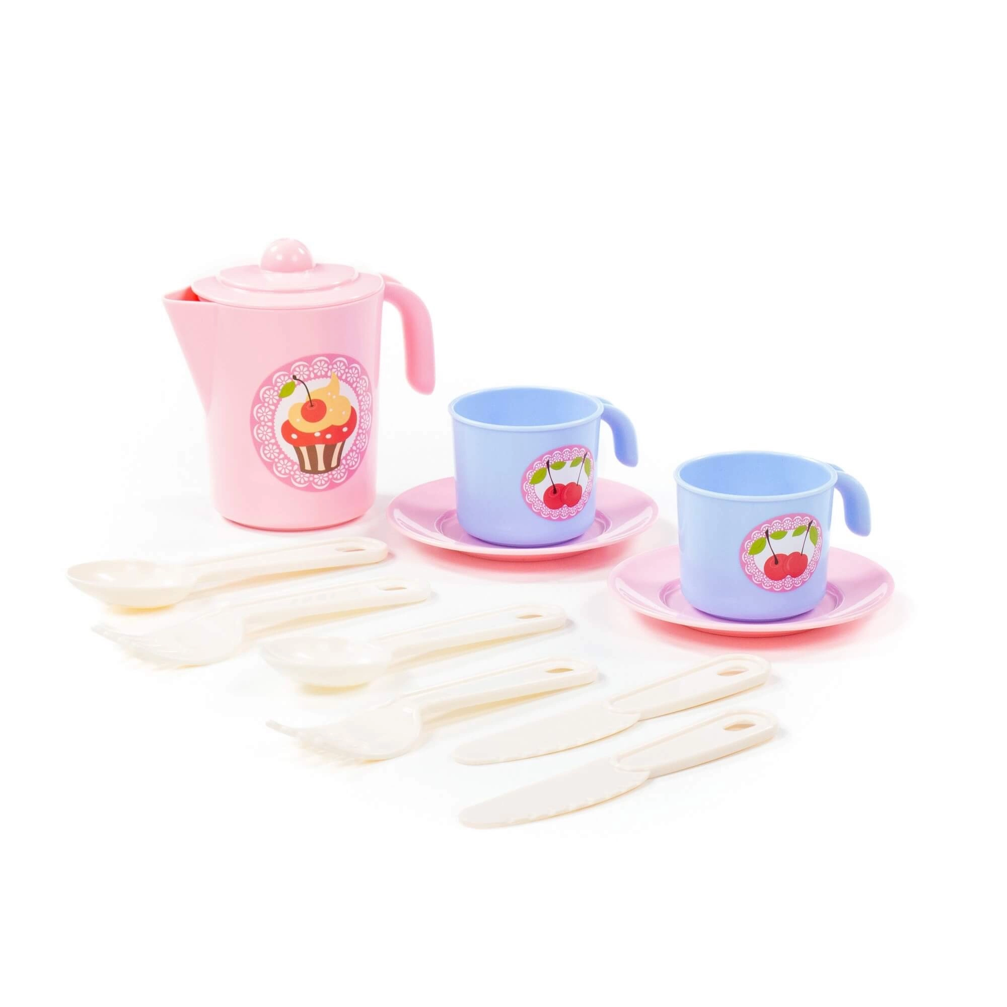 Dětská čajová sada pro dva nabízí 12 barevných dílů pro kreativní hraní na čajový dýchánek. Díky lehkému plastu a zaobleným hranám je ideální pro malé ruce. Součástí je růžová konvička s víčkem, modré hrnečky se stylovými samolepkami a bílé příbory. Podporuje fantazii, společenskou hru a jemnou motoriku.