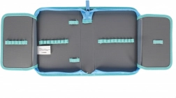 Vnitřek s gumičkami a přepážkami umožňuje systematické uložení psacích potřeb a doplňků, aby bylo vše okamžitě po ruce.
