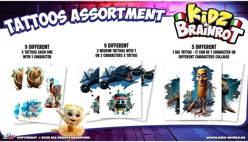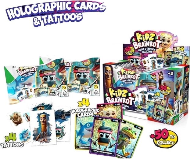 Balíček Italian Brainrot přináší porci zábavy i sběratelského vzrušení. V každém balení získáte 4 kartičky a 4 dočasná tetování s tématikou Italian Brainrot, vždy v náhodném mixu motivů. Skvělé pro výměny s kamarády, sbírání oblíbených designů i ozvláštnění stylu.