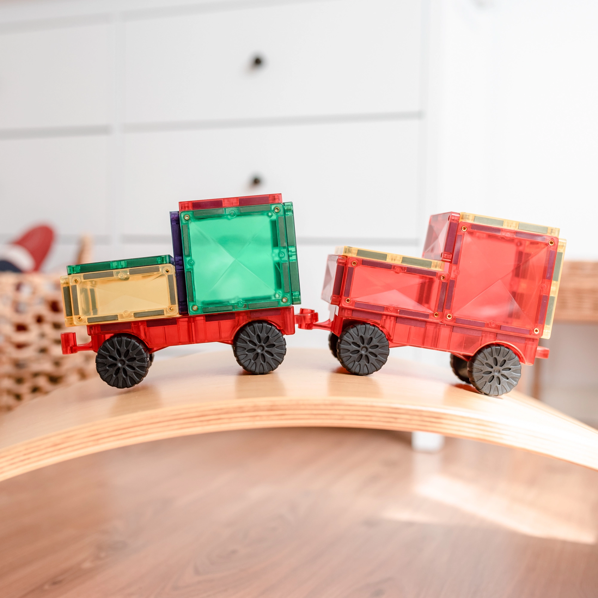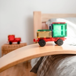 Dva podvozky s koly promění stavebnici v dynamickou hru – od náklaďáků po vláčky. Stavějte, propojujte a vydejte se na cestu.