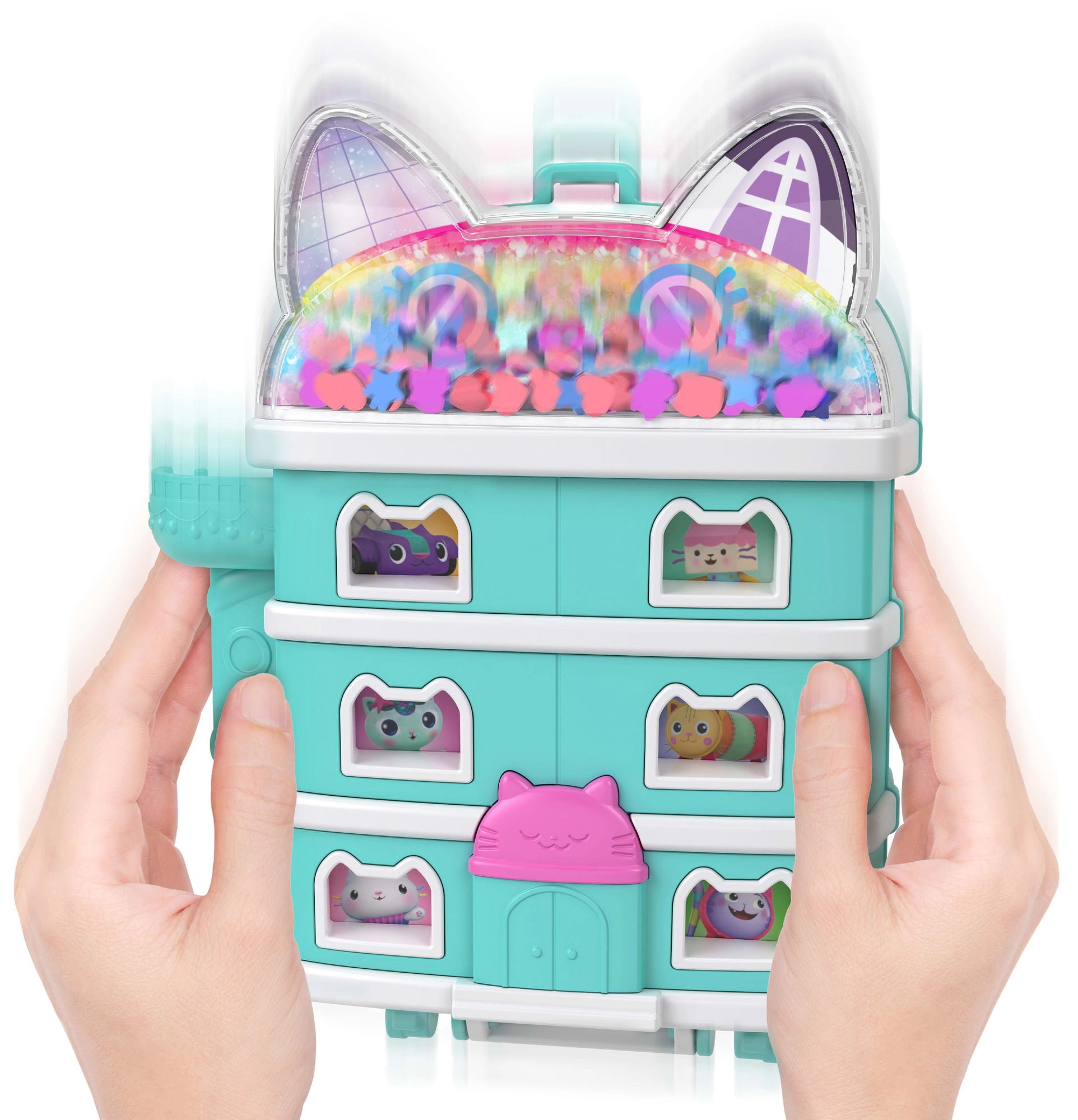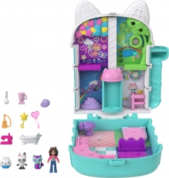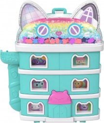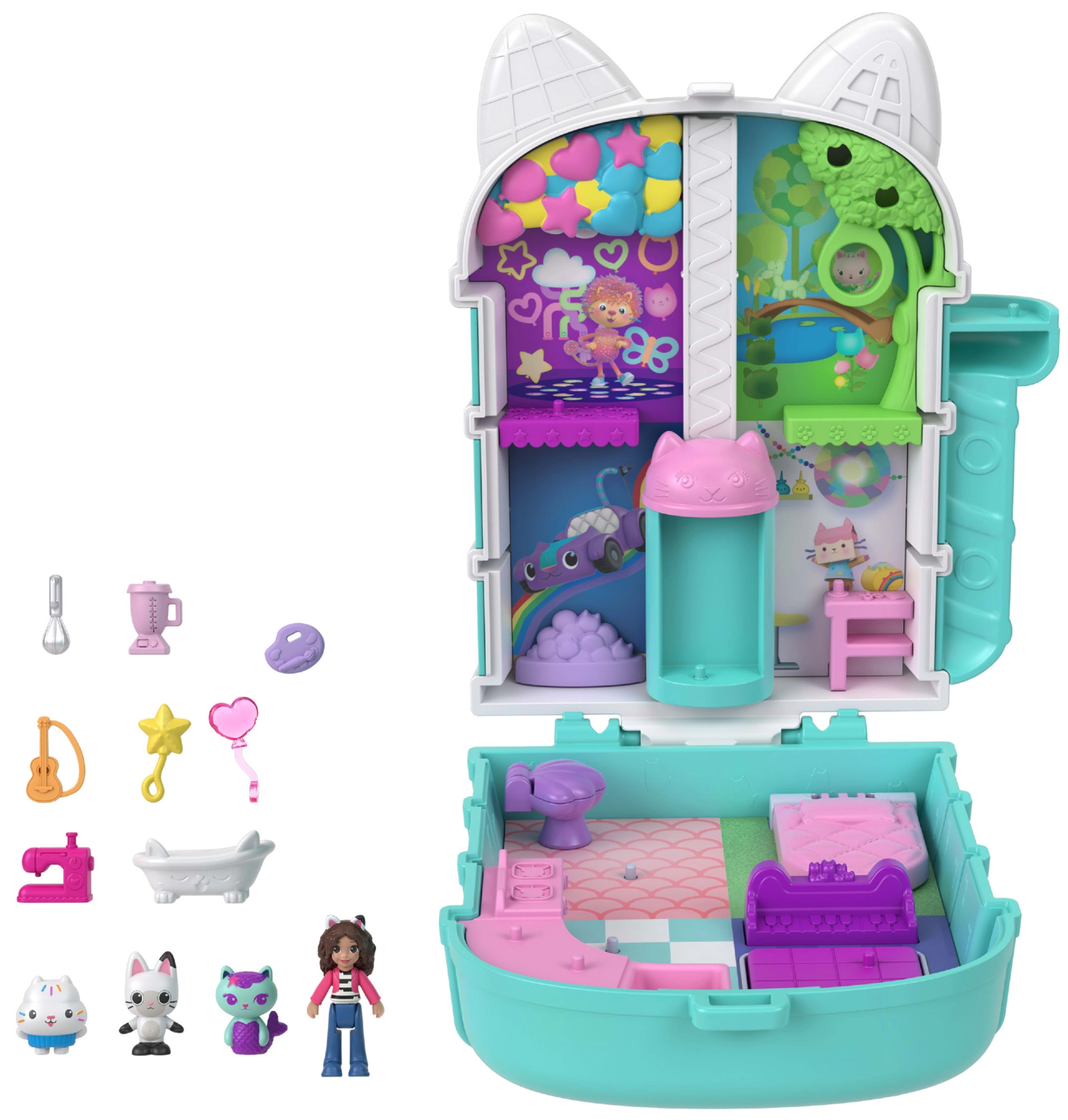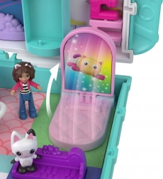 Kompaktní kočičí domek Polly Pocket přináší dětem bohatý svět fantazie v malém, přenosném pouzdře. Po otevření se odhalí vícepatrové interiéry s tematickými pokojíčky, třpytivou kopulí a pohyblivými prvky, které vybízejí k příběhům inspirovaným GABBY’S DOLLHOUSE.