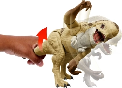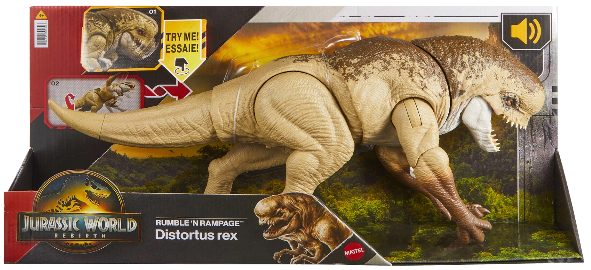 Připravte se na velkolepé souboje s realistickou figurkou Distortus Rex vysokou cca 50 cm ze série JURASSIC WORLD Odrodzenie od značky Mattel. Dinosaurus nabízí děsivý ryk na tlačítko, kousání s pohybem předních končetin a boční úder ovládaný ocasem. Díky detailní textuře kůže, vysoké artikulaci a AR interakci v aplikaci je to perfektní dárek pro malé dobrodruhy i fanoušky dinosaurů.