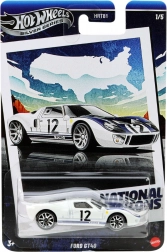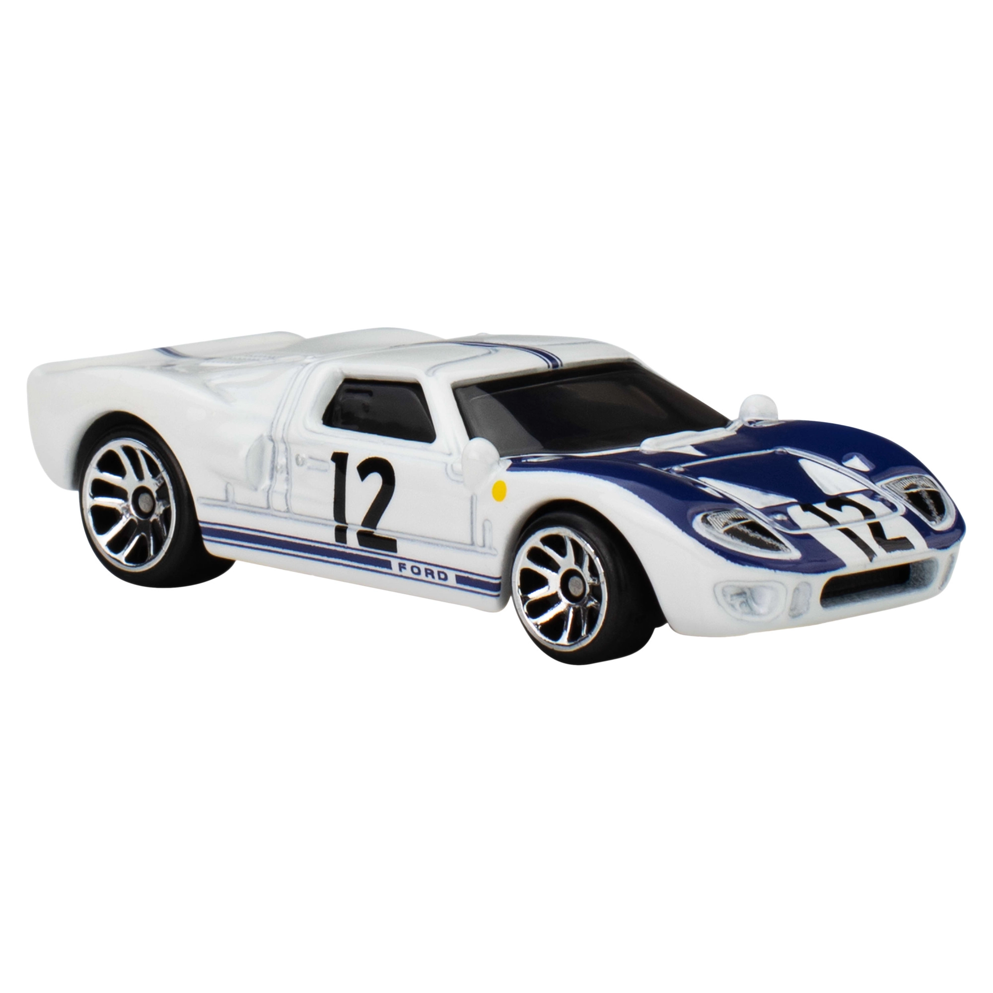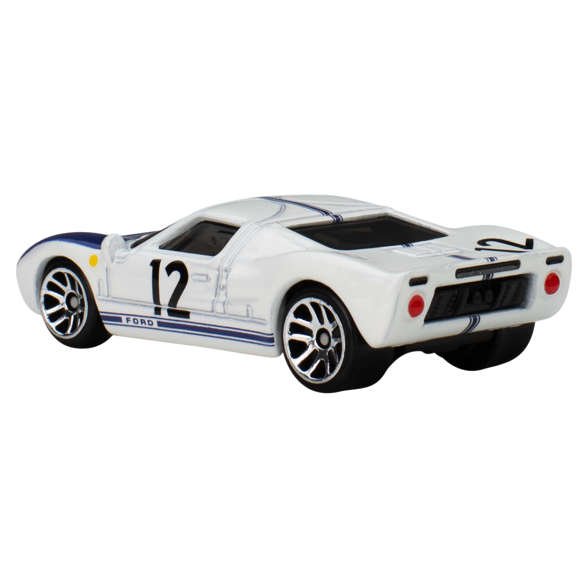 Ikonický model FORD GT40 ze série Hot Wheels Silver Series – National Icons v měřítku 1:64. Kovová karoserie, realistické detaily, pohyblivá kola a bílý lak s modrými pruhy a číslem 12 potěší děti i sběratele.