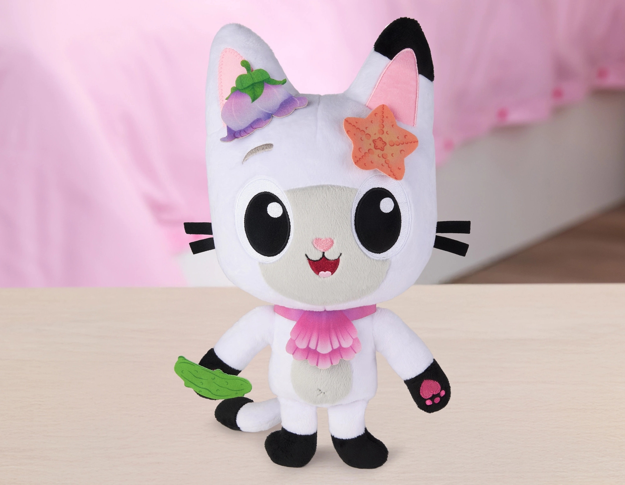 Roztomilá interaktivní kočička Pandy Paws z oblíbeného seriálu GABBY'S DOLLHOUSE potěší každé dítě. Jemný plyš, bezpečné vyšívané detaily a příjemná velikost 30 cm lákají k mazlení. Stiskem tlačítka spustíte melodie, chechot a zvuky postavičky (nezávislé na jazyku). Perfektní kamarád na hraní, usínání i cestování.