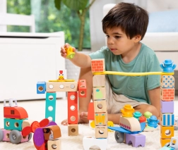 Stavebnice rozvíjí klíčové dovednosti: jemnou motoriku, koordinaci oko–ruka, tvořivost a logické myšlení. Děti mohou skládat, spojovat, točit a jezdit s hotovými výtvory. Kvalitní dřevo s certifikací FSC a odolné zpracování zajišťují dlouhou životnost i při každodenním hraní.