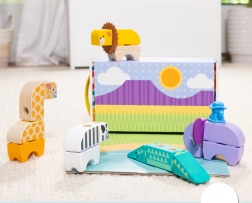 Tato barevná sada dřevěných kostiček se safari tématem přináší dětem možnost stavět, skládat a kombinovat části zvířátek, jako je lev, zebra, žirafa, krokodýl či hroch. Velké, hladké díly se pohodlně drží a jsou navržené pro bezpečnou a samostatnou hru dětí od 2 let.