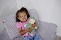 Plyšová panenka Squishbabies v jemném zeleném oblečku je navržena pro mazlení, uklidnění a první hraní. Díky hebkým materiálům a oblečku s reliéfní manšestrovou strukturou poskytuje smyslově příjemný zážitek a zároveň působí uklidňujícím dojmem.