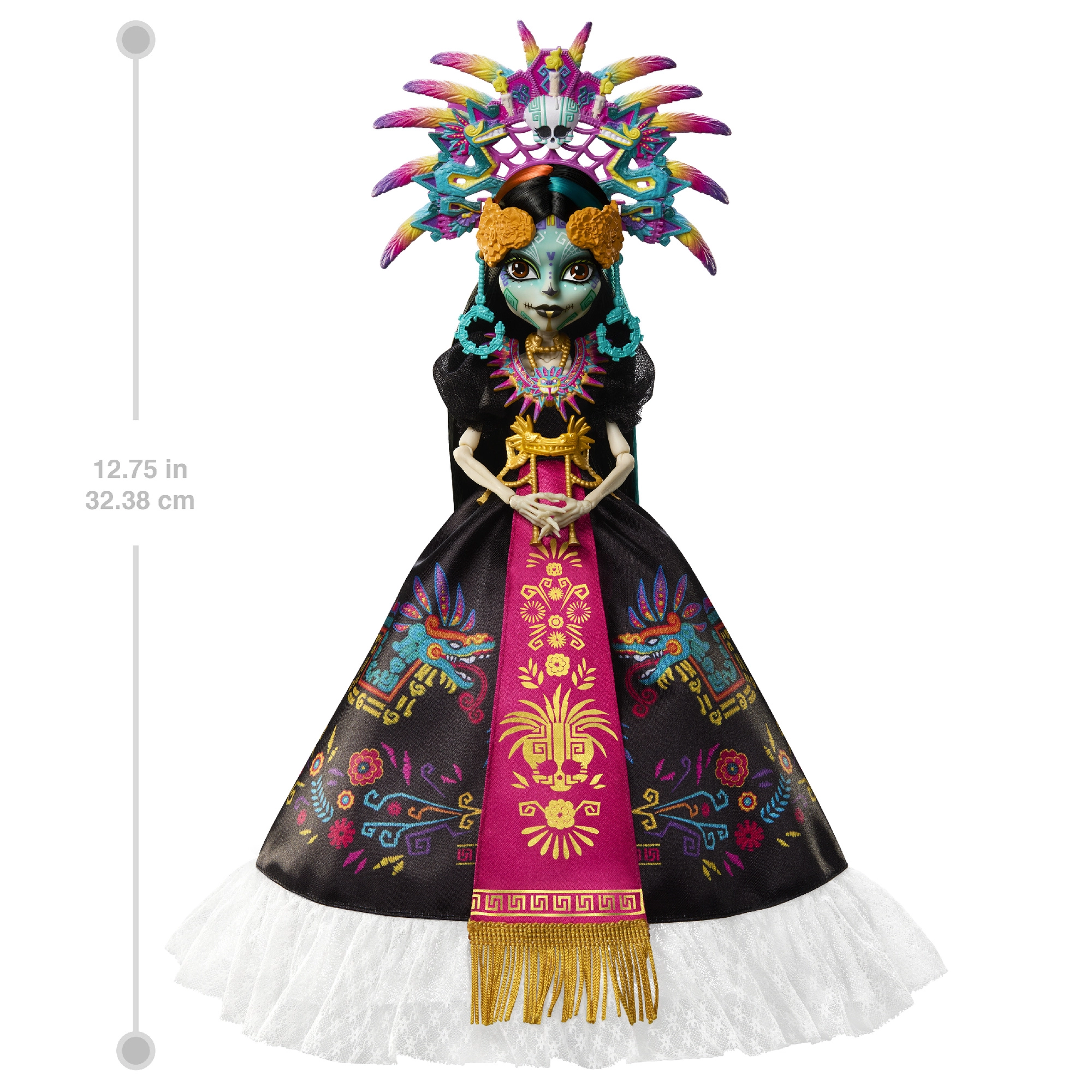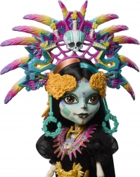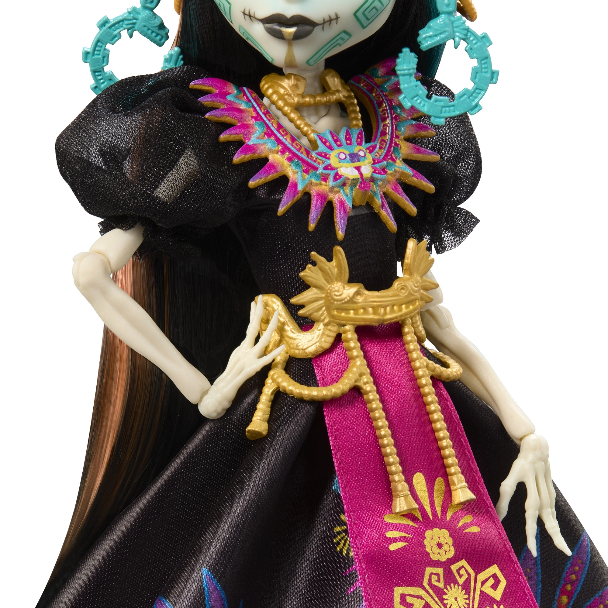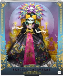 Sbírková edice Monster High Skullector vzdává hold mexickému svátku Día de Muertos. Skelita Calaveras okouzlí dlouhými černými šaty se saténovým leskem, barevnými potisky a výraznou magentovou šerpou se zlatými třásněmi. Dominantní pérovaná čelenka, výrazné šperky a detailní face paint z ní dělají výjimečný kousek pro fanoušky designu i kultury.