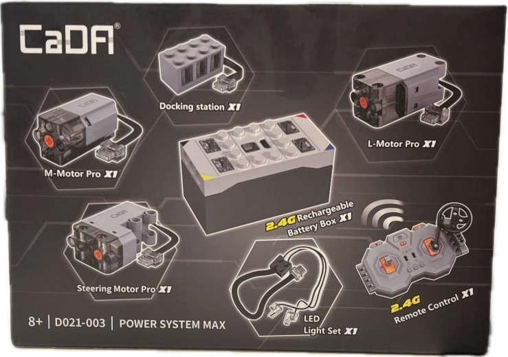 Rozšiřte své stavebnice CADA o realistický pohon a osvětlení díky sadě Power System Max. Získáte přesné 2,4 GHz ovládání bez rušení, dlouhou výdrž na akumulátor a kompatibilitu s mnoha modely ve standardní velikosti. V balení najdete tři výkonné motory, LED osvětlení, dálkový ovladač a USB nabíjecí kabel – vše, co potřebujete pro posunutí zábavy na nový level.