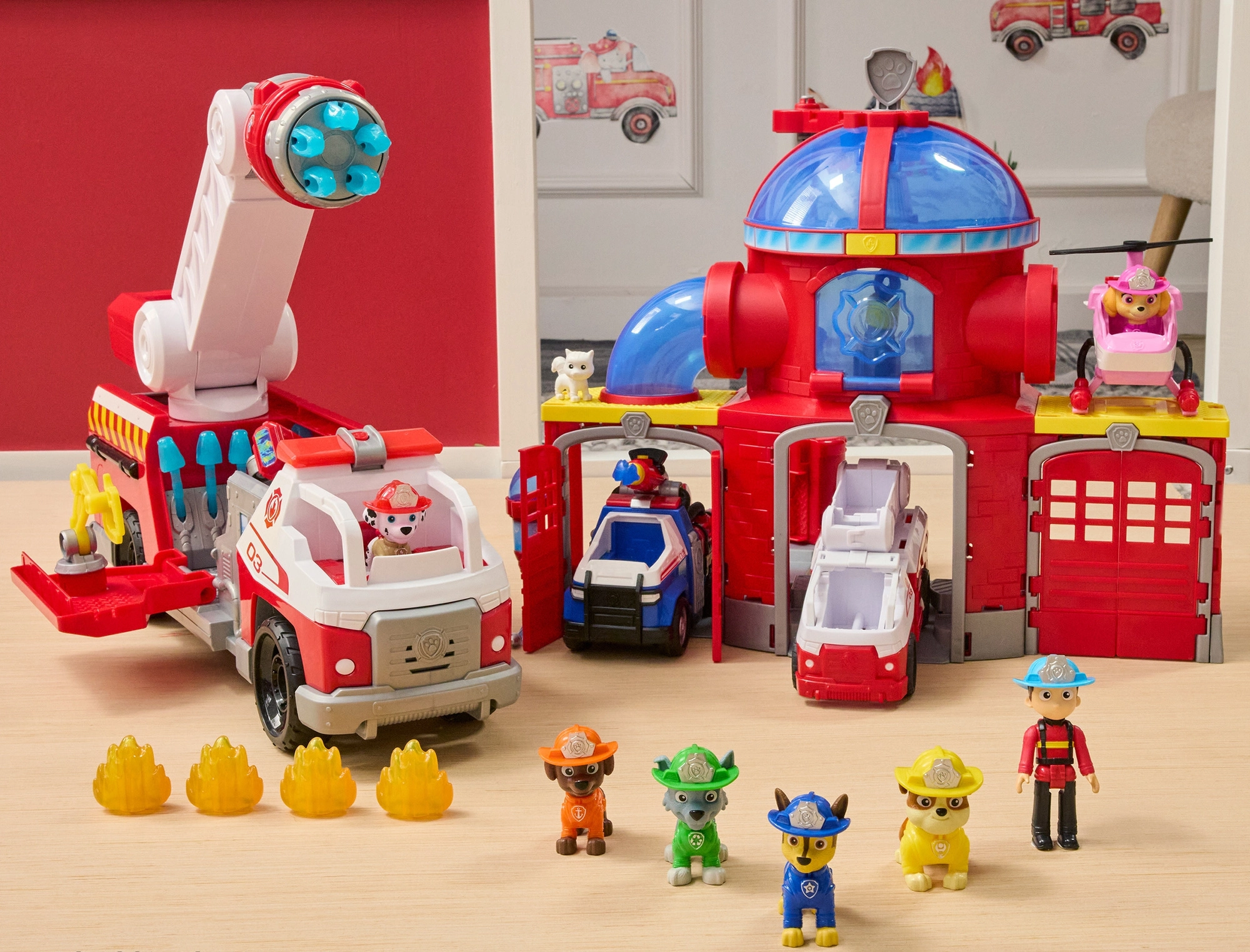 Seznamte se s oblíbeným dalmatinem Marshalllem a jeho parádním hasičským vozem inspirovaným seriálem PAW Patrol. Děti mohou posadit figurku do kabiny a vyrazit k zásahu, zvednout žebřík a pomocí děla vystřelit modré „vodní“ projektily na imaginární plameny. Tato hračka podporuje fantazii, jemnou motoriku i tematickou hru na záchranáře.