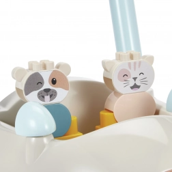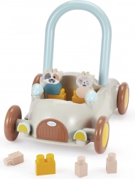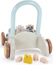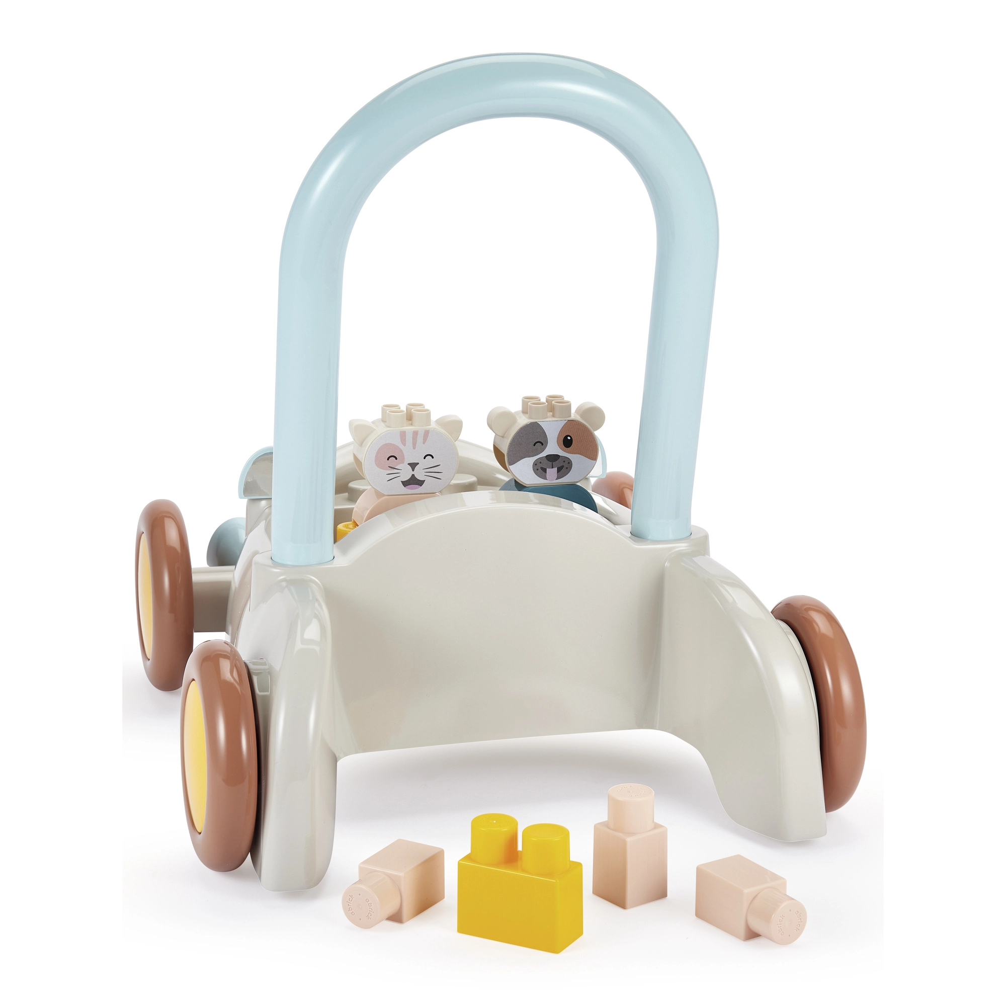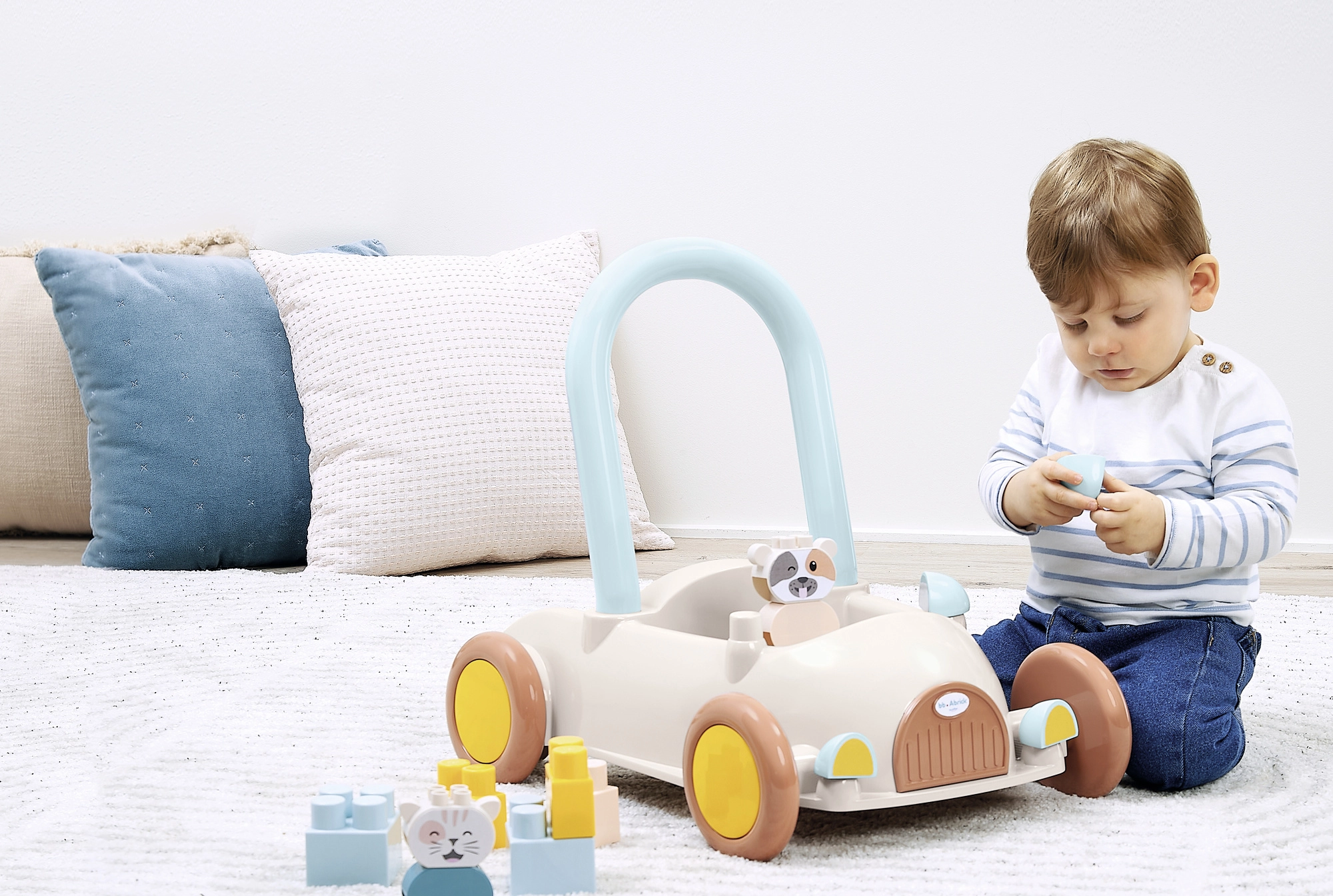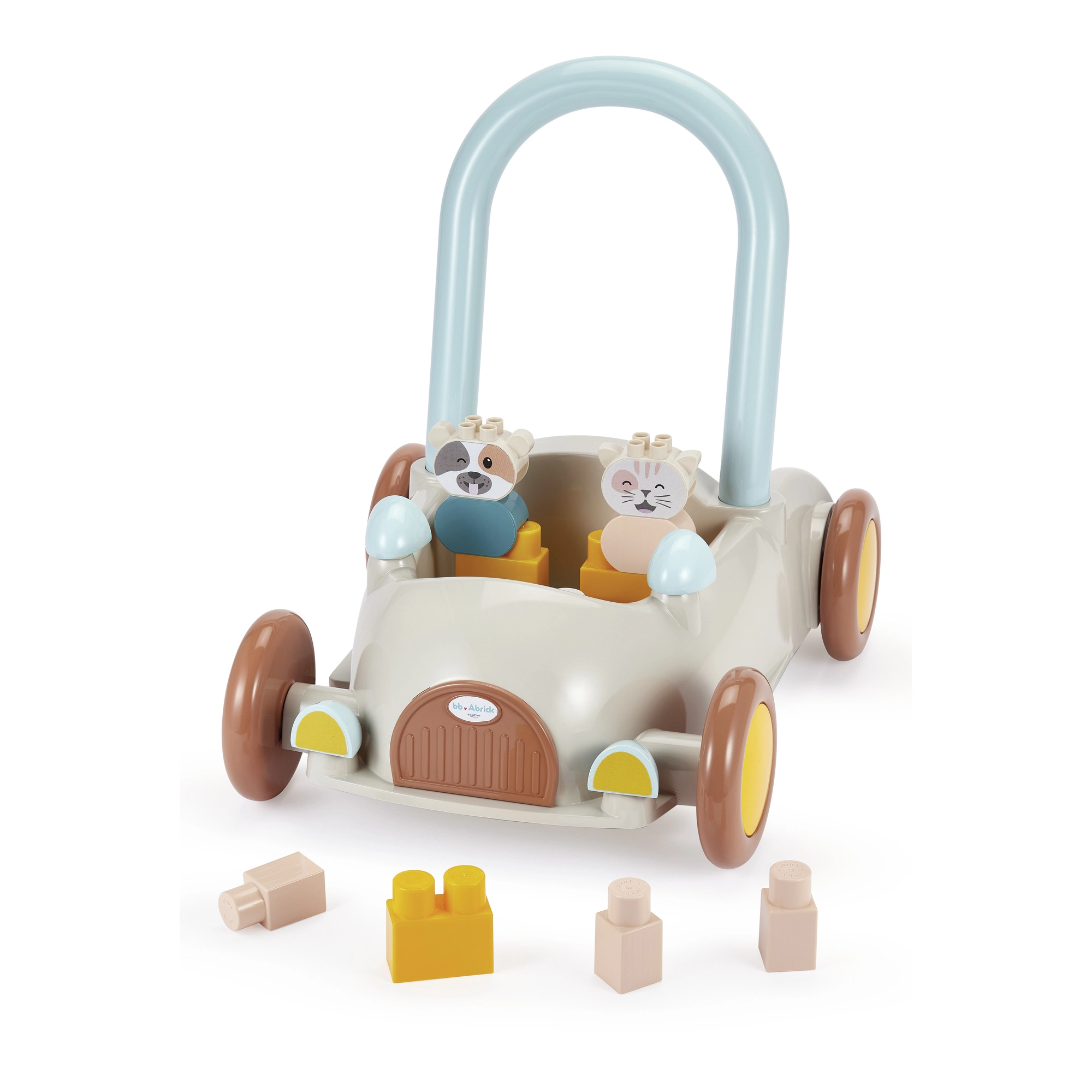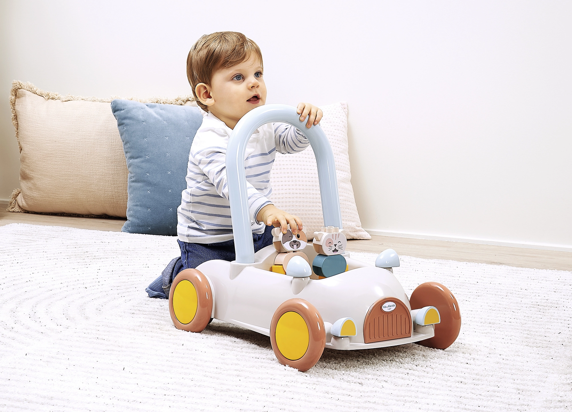 Objevte multifunkční pchací autíčko s kostkami, které malým dětem pomůže s prvními krůčky a současně je zabaví skládáním. Autíčko má praktické madlo pro tlačení nebo tažení, široká kolečka pro jistý pohyb a uvnitř prostor pro kostky. Součástí je přibližně 16 stavebních dílků a dvě roztomilé postavičky kočičky a kravičky, které podporují fantazii a tematickou hru.