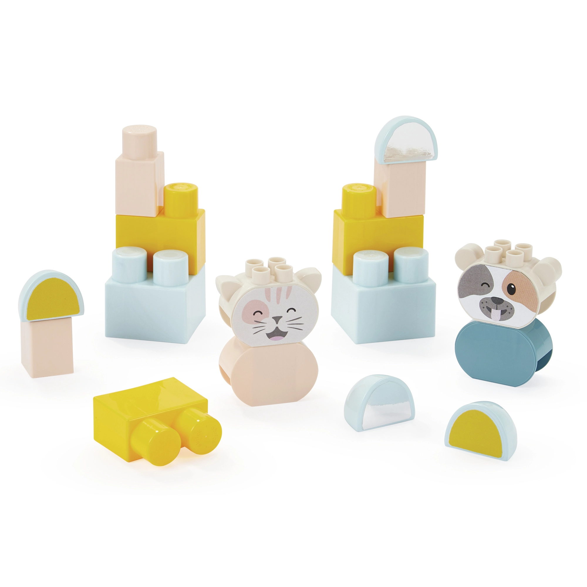 Sada obsahuje přibližně 16 kostek a dvě postavičky kočičky a kravičky. Velké, zaoblené díly jsou ideální pro malé ruce a podporují kreativní stavění.
