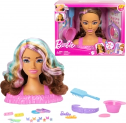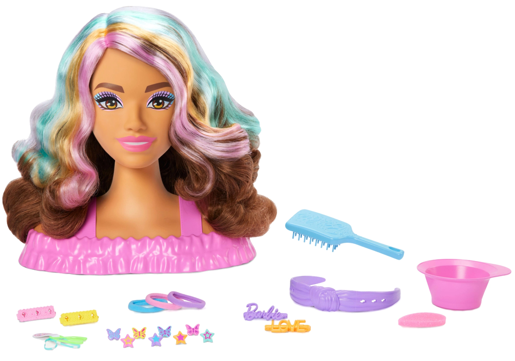 Staňte se malou kadeřnicí s hlavou na česání BARBIE a bohatou sadou doplňků. Dlouhé hnědé vlasy s pastelovými proužky lákají k tvorbě copánků, drdolů i culíků. Součástí jsou klipy a gumičky, kartáč, čelenka a zábavné efekty změny barvy u sponek i rtů pomocí houbičky. Ideální pro kreativní hru a rozvoj jemné motoriky.