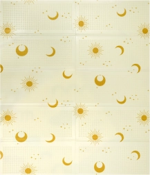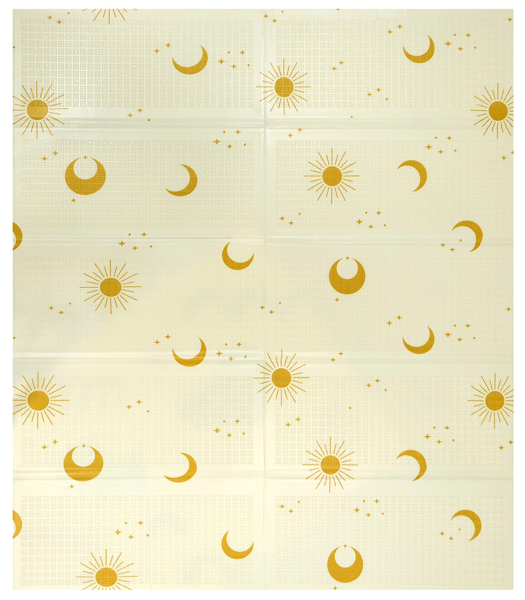 zajišťuje výborné tlumení nárazů, tepelnou izolaci od chladné podlahy a dlouhou životnost bez zápachu a bez toxických látek. Podložka je vhodná do dětského pokojíčku, obýváku i na ven – na balkon, zahradu či piknik. Oboustranný tisk v jemných barvách s motivy slunce a měsíce a barevných tvarů podporuje vnímání a ladí s moderním interiérem.