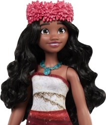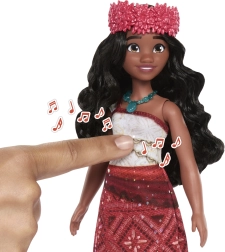 Panenka Moana přináší dětem atmosféru polynéských dobrodružství. Má dlouhé, vlnité vlasy pro česání, detailní outfit s potiskem a stylové doplňky. Díky artikulaci lze panenku snadno polohovat a oživovat oblíbené scény z filmu.