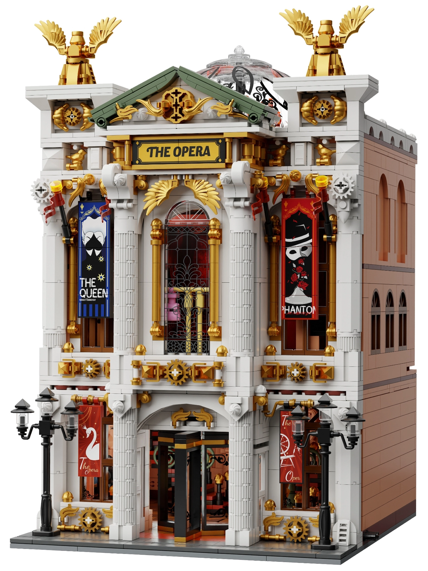 Tato sběratelská stavebnice přináší atmosféru velkolepé opery přímo na váš stůl. Fasáda s zlacenými detaily, sloupy, bannery a pouličními lampami zaujme na první pohled, zatímco interiér a vstupní část vybízí k inscenování vlastních příběhů.