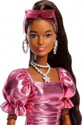 Panenka BARBIE Deluxe Style vyniká moderním lookem a kvalitními materiály. Lesklé korálové šaty s objemným spodním dílem, růžové brýle, kruhové náušnice, vrstvený náhrdelník a elegantní kabelka tvoří dokonalý outfit pro přehlídkové molo i každodenní příběhy. Dlouhé tmavé vlasy ve vysokém culíku podtrhují trendový vzhled.